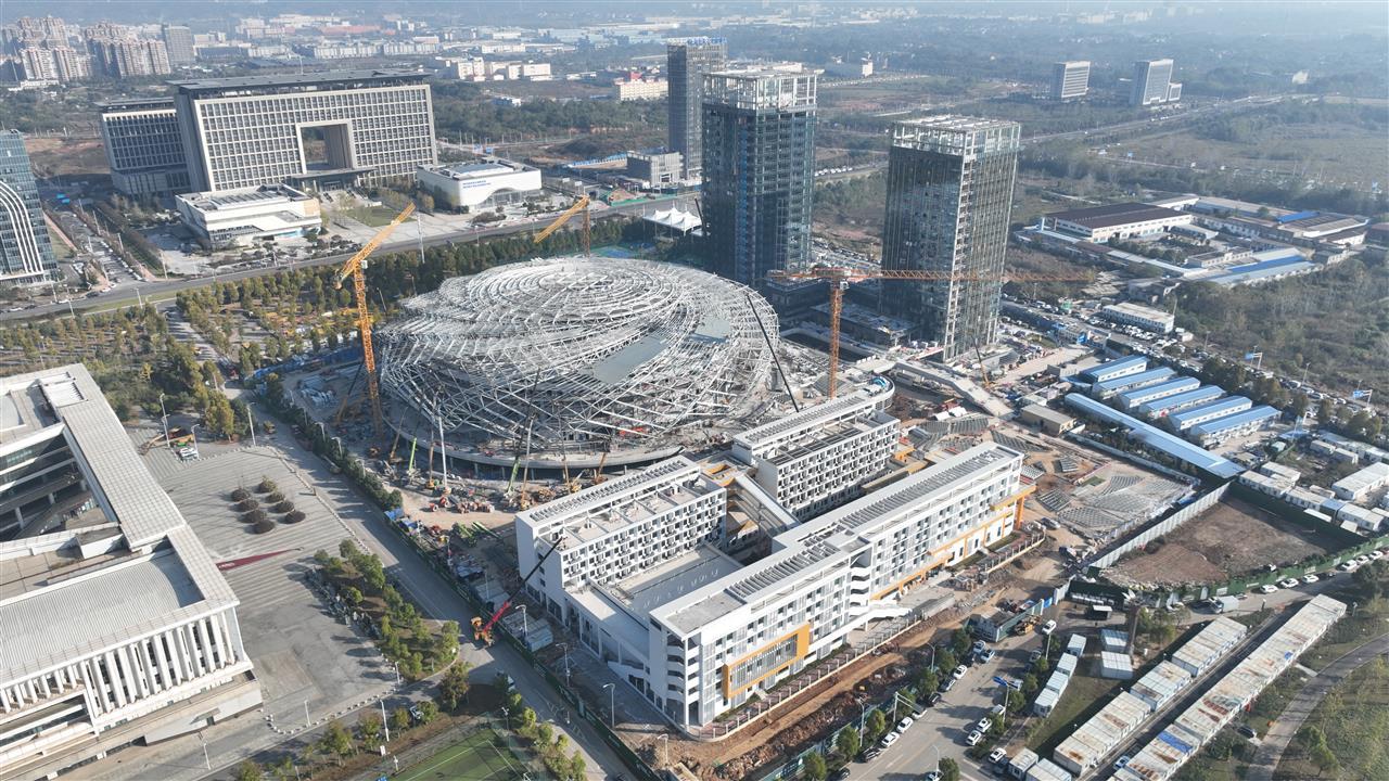 面对流动曲面、空间跨度超百米极具挑战性的结构难题,中国一冶施工团队采用全新的施工工艺,简单来说,施工人员先在地面把“花瓣”(桁架)拼装好,再吊到高空把它旋转至安装位置,最后将“盖子”(穹顶网壳)提升到位,既能保证安装精度,又能确保作业人员安全。