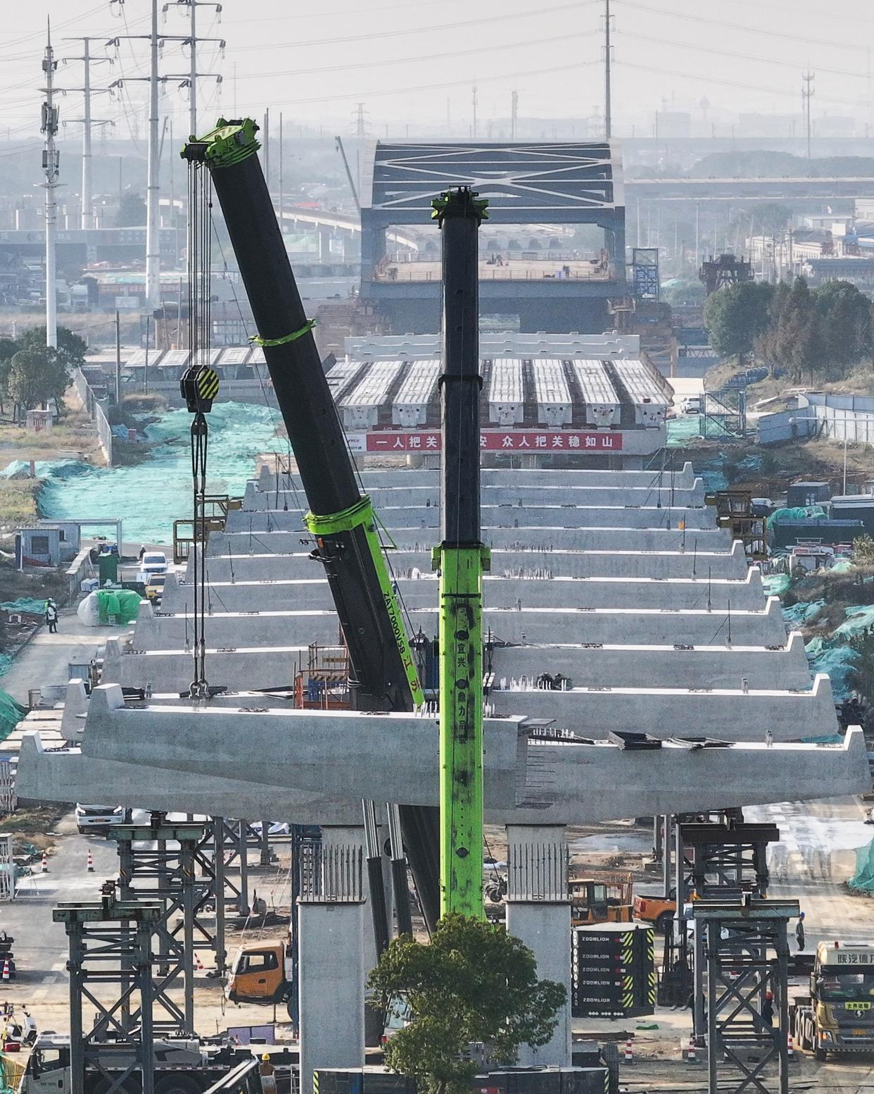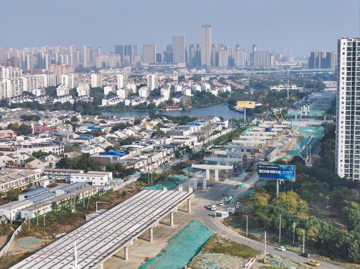这是11月24日拍摄的312国道无锡凤翔路至广石路段工程11标架梁作业现场(无人机照片)。新华社记者 季春鹏 摄