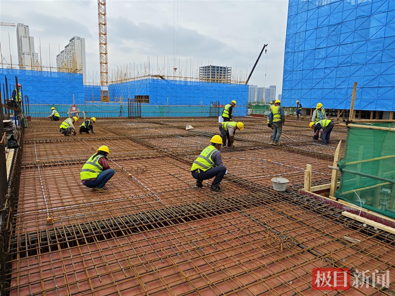 钢筋绑扎热火朝天、脚手架如同“钢铁森林”拔节向上。11月22日,武汉汽车科技总部产业园一期项目内塔吊林立,蓝色的定型化外架内,千余名工友正进行地上主体结构及地下砌体、机电工程施工。