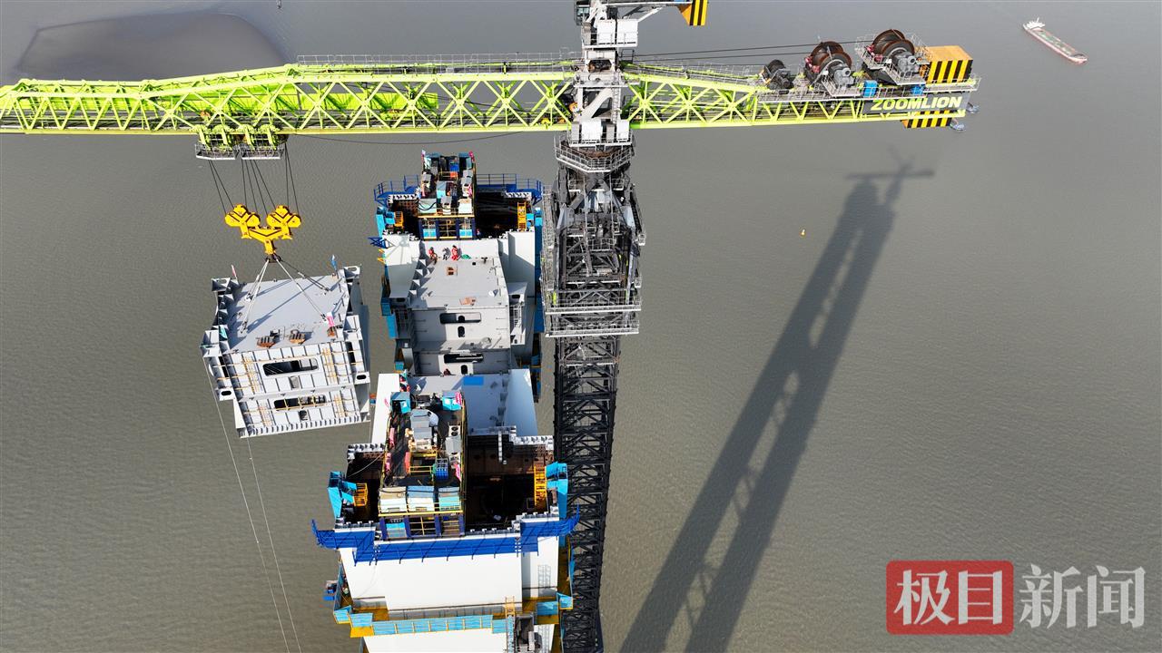 南航道桥两座主塔均设有三道横梁,本次合龙的上横梁分为三个节段进行吊装,最重节段达262吨,施工中采用全球首台万吨米级塔吊进行安装,并运用全断面焊接连接工艺。在合龙段安装前,项目团队依托三维数字化技术进行全过程模拟,成功将焊缝宽度精确控制在6至10毫米之间,实现了无应力状态下的高精度合龙。