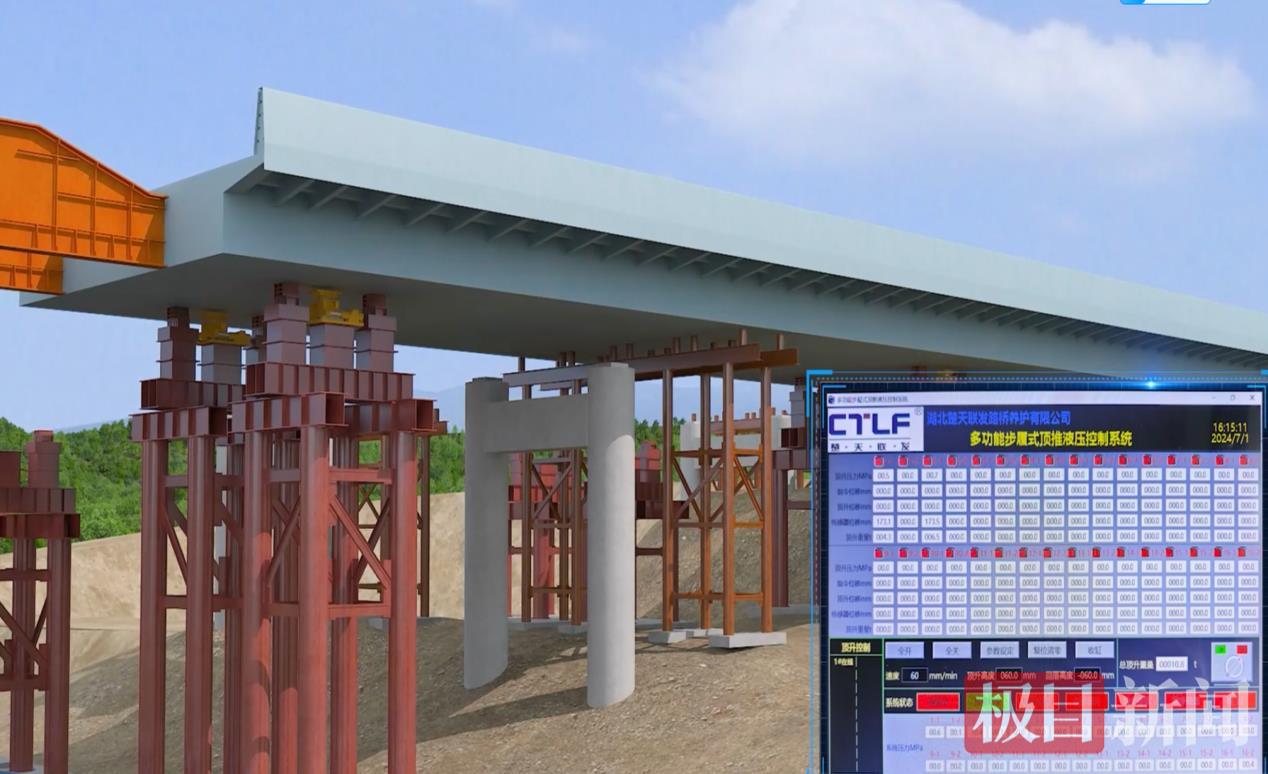 为攻克这一难题,项目团队组建专项技术攻坚组,创新采用步履式顶推工艺,依托BIM技术构建三维模型,反复开展施工全过程动画模拟,精准预判并解决多台顶推设备同步联动、顶推过程侧向偏移等核心痛点。通过建立“竖向起顶、水平顶推、侧向纠偏”三位一体精准控制体系,实现施工毫米级精度把控。钢箱梁在杭瑞高速南侧完成拼装后,借助20米导梁沿设计路线平稳顶推跨越高速,最终实现全程零误差就位,成功完成这场“高空重载穿越”。