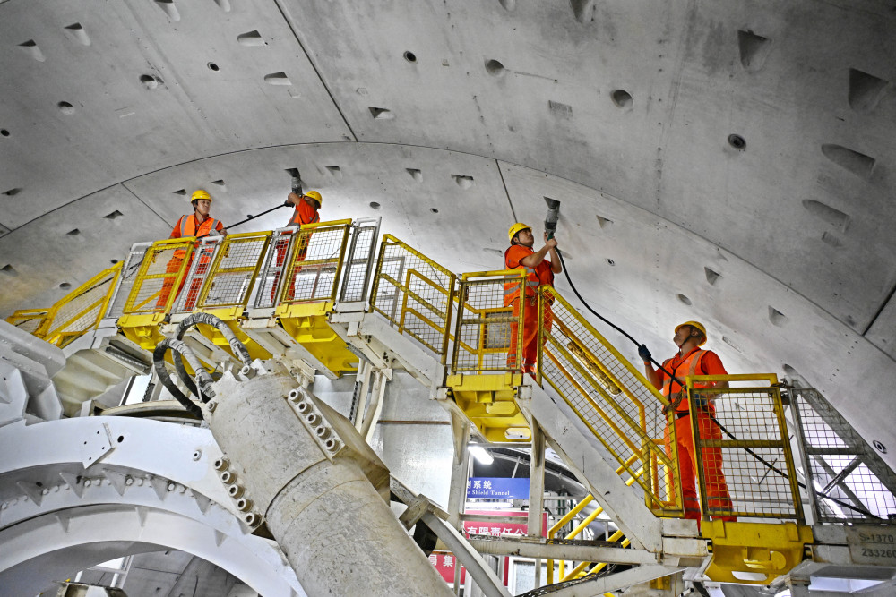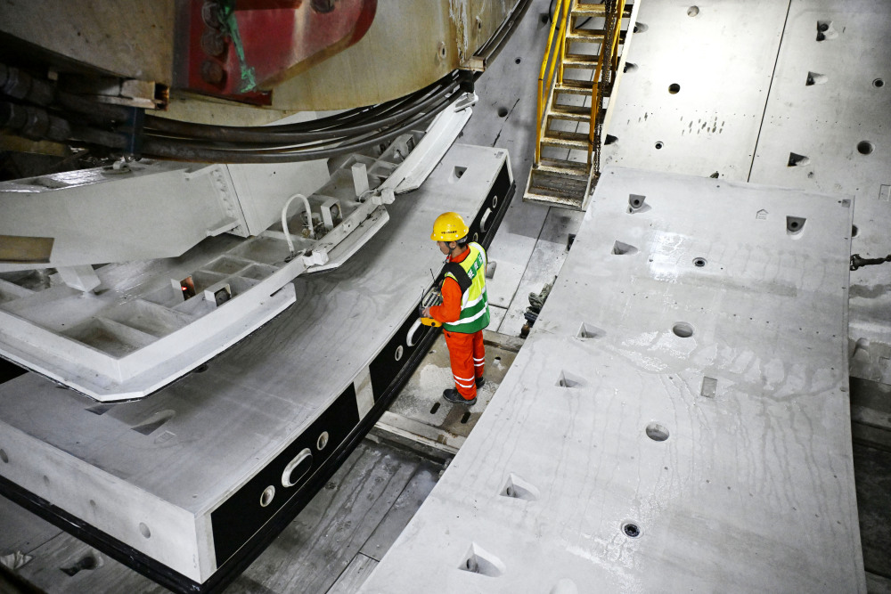 12月15日,中铁十四局建设者在海平面下91米进行管片安装作业。新华社记者 李紫恒 摄