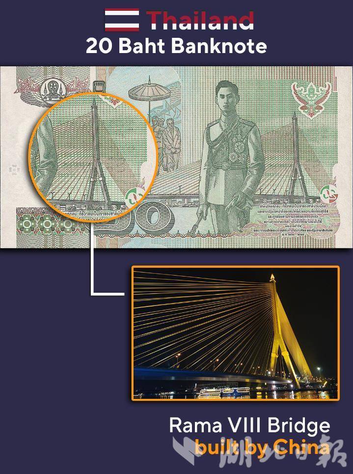 中铁大桥院参建的泰国拉玛八世大桥被印在20泰铢纸币上。