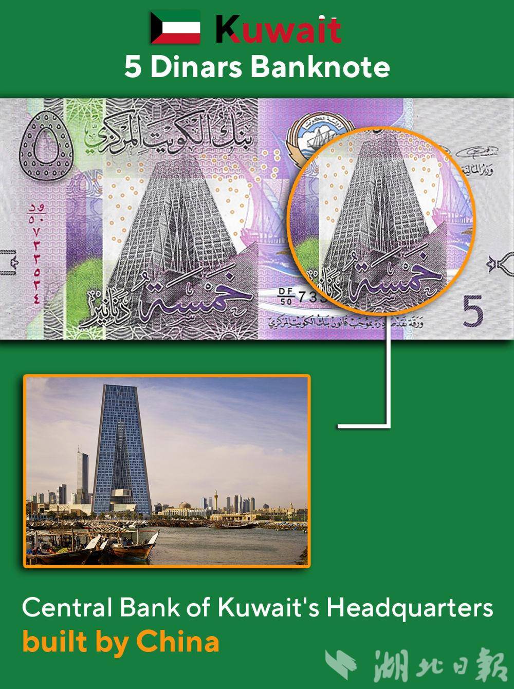 中建三局承建的科威特中央银行被印在科威特5第纳尔纸币上。