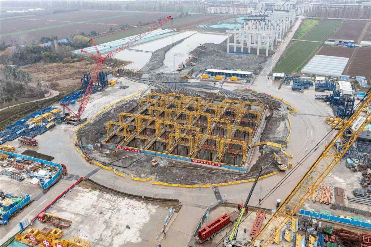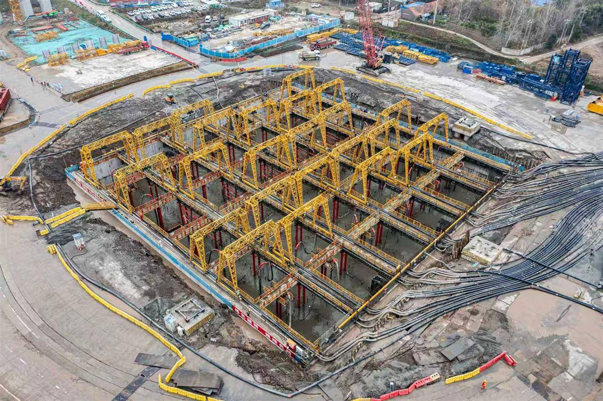 锚碇是一座大桥的“基石”,也是“定海神针”,由沉井和锚体组成,它承担着固定桥梁缆索的巨大拉力。大型沉井可提供充足配重,确保锚碇的稳固。汉南长江大桥锚碇采用整体式沉井基础,平面尺寸为76.4米×76.4米,相当于14个篮球场大小,结构总高43米相当于15层楼高,竖向分8节,为公路工程世界第一大陆域沉井。