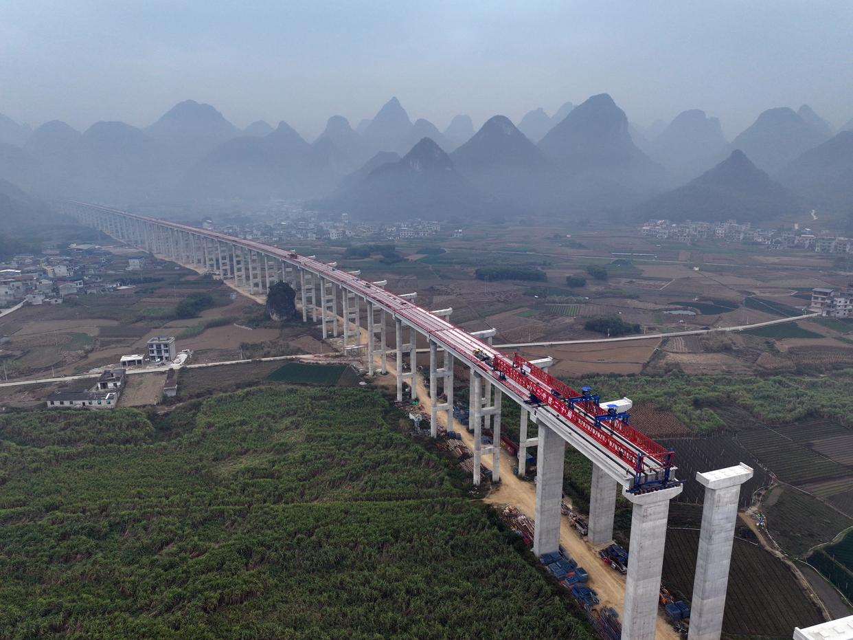 12月23日,中铁二十局的工人在柳州市柳江区三都镇鱼宜高速公路建设工地作业(无人机照片)。新华社发(郑昌昊 摄)