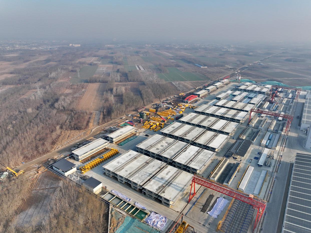 这是中铁十一局石雄铁路2标段安国制梁场(12月23日摄,无人机照片)。新华社记者 牟宇 摄