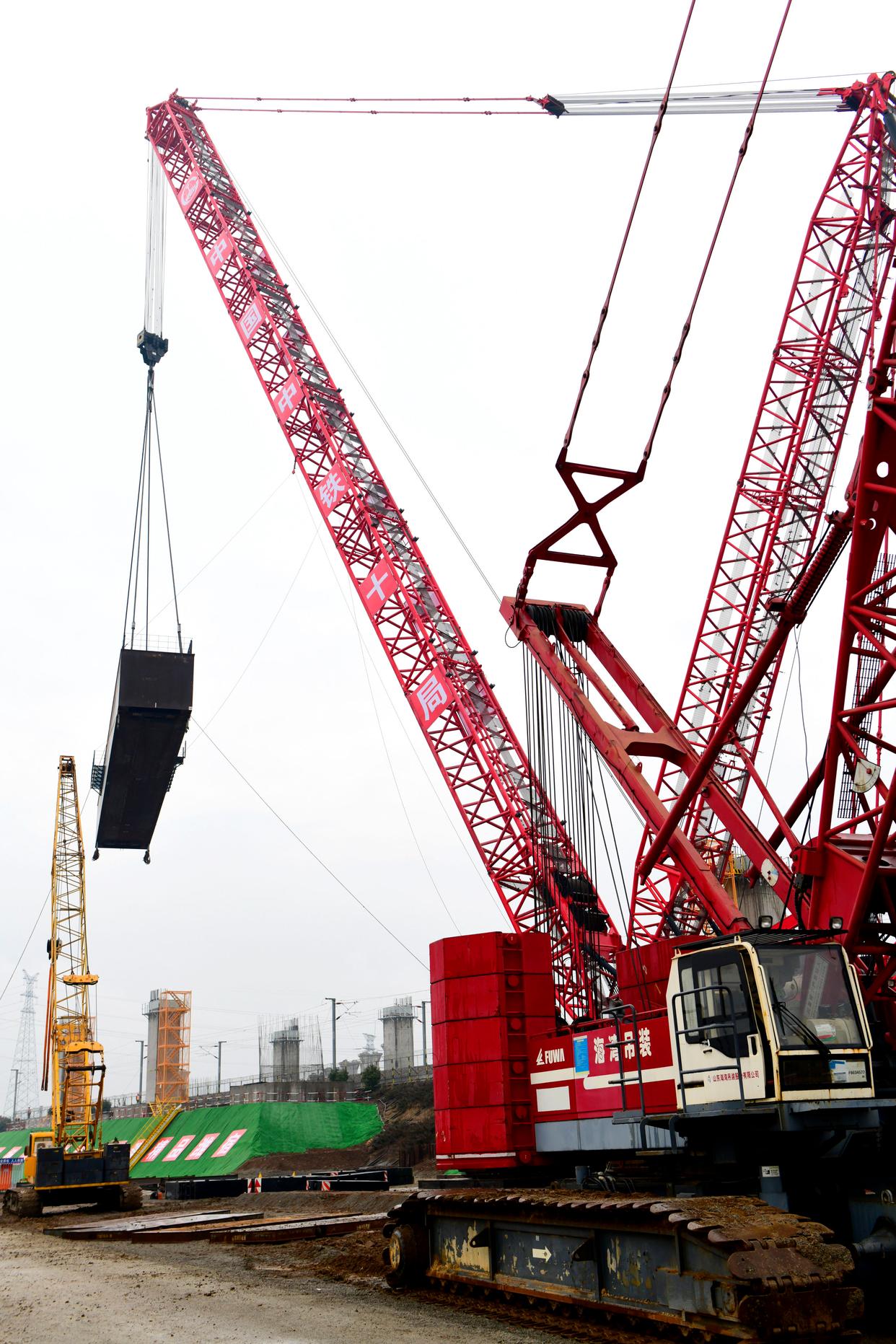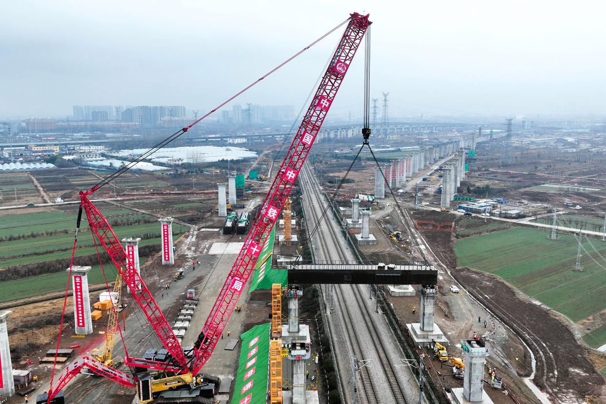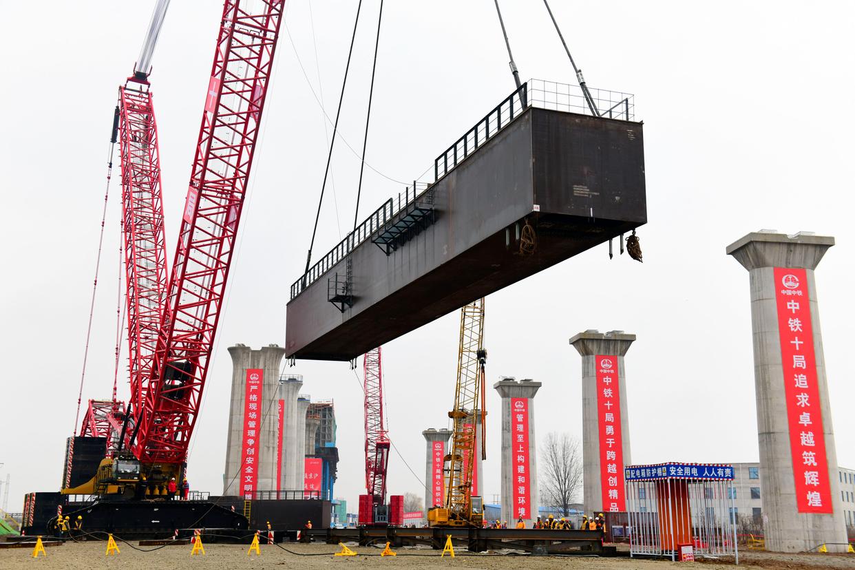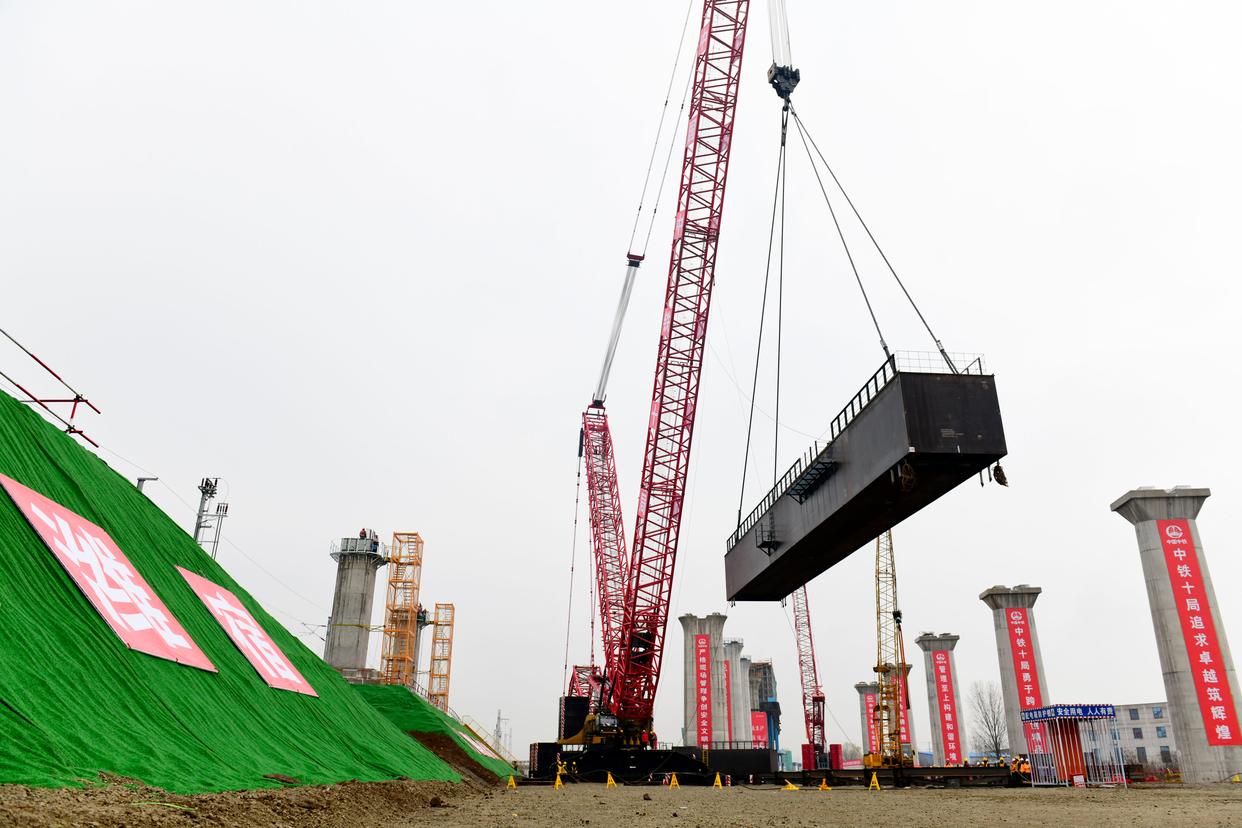 12月23日,在潍(坊)宿(迁)高铁临沂段站前8标,中铁十局的工作人员进行钢横梁吊装作业。新华社记者 郭绪雷 摄