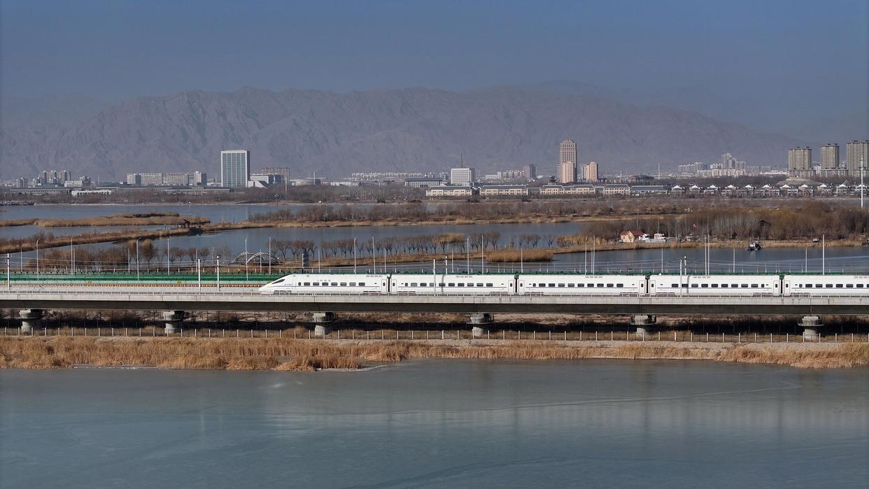 12月23日,包银高铁首发列车D4667次动车组行驶在石嘴山境内(无人机照片)。新华社记者王鹏 摄 时空重构:从路网末梢到国家动脉