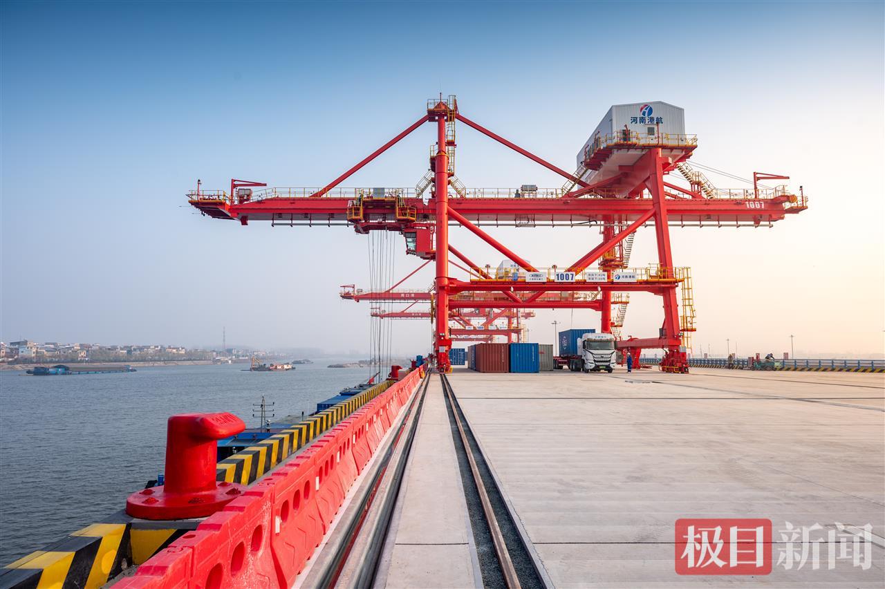 项目位于周口市商水县沙颍河南岸,是河南省首个百万级专用集装箱码头定位的高标准港口项目,占地2061亩,规划建设13个2000吨级集装箱泊位,一期开港先行投用6个泊位。