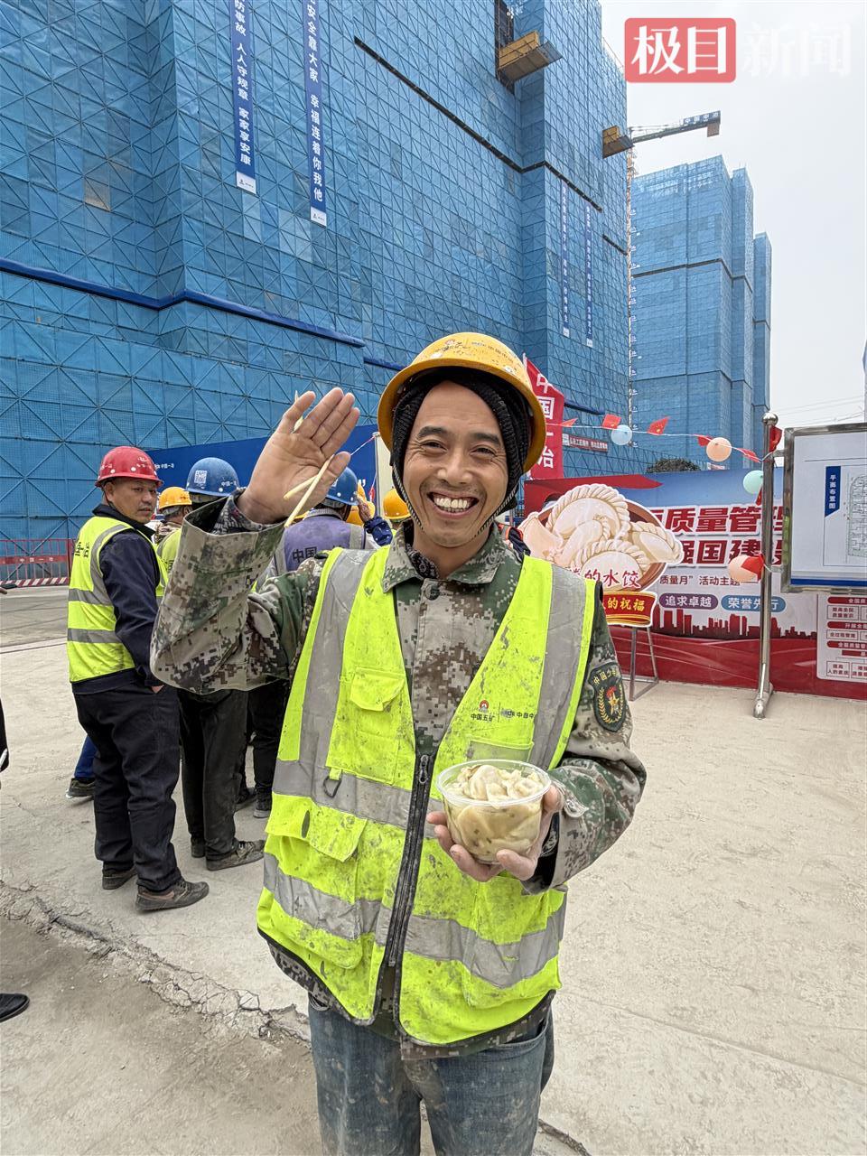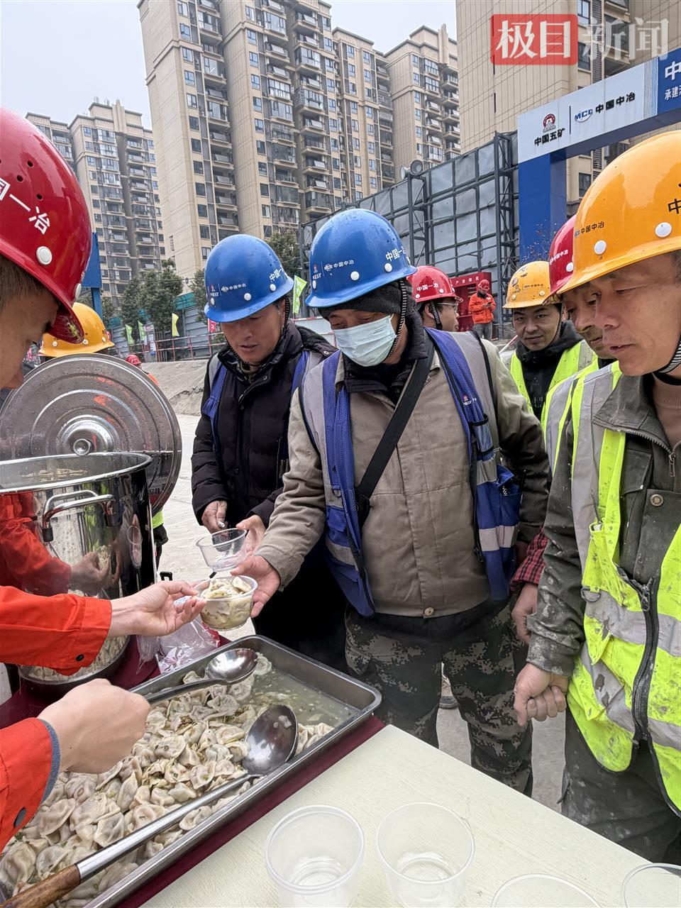 在现场通道旁的红桌上,蒸腾的热气裹挟着饺香弥漫开来。戴着安全帽的工人们,身着沾满灰渍的反光背心,有序排队领取盛满饺子的餐盒。