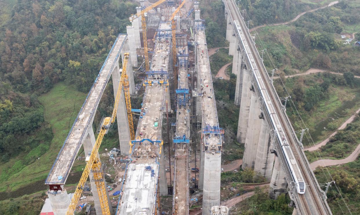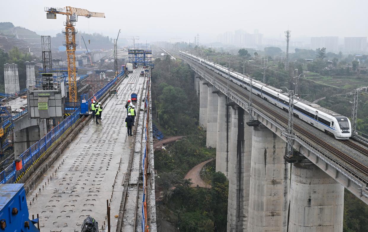 12月25日,列车驶过渝万高铁打青沟左线大桥连续梁建设现场。新华社记者 陈诚 摄