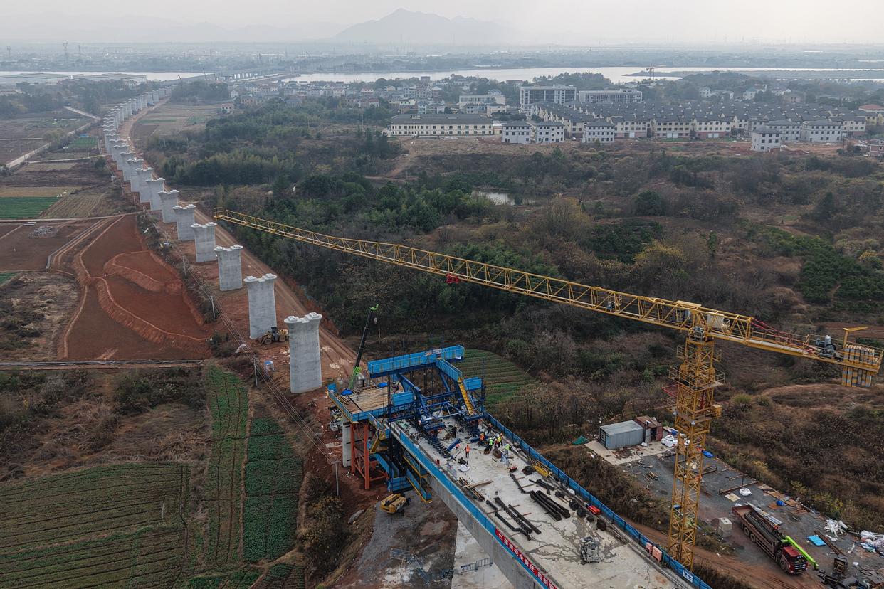 12月25日拍摄的衢丽铁路衢江特大桥连续梁施工现场(无人机照片)。新华社记者 黄宗治 摄