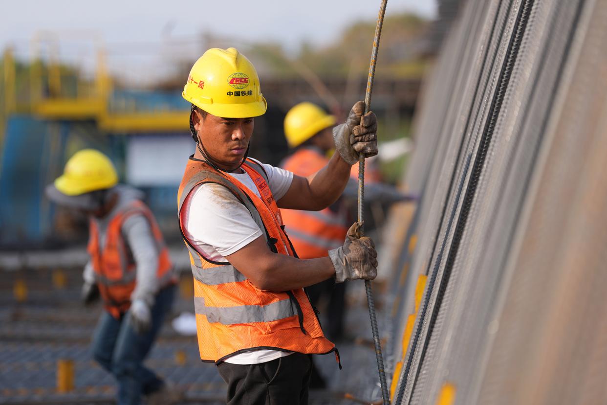 12月25日,中铁十一局建设者在衢丽铁路小南海制梁场进行制梁施工作业。新华社记者 黄宗治 摄