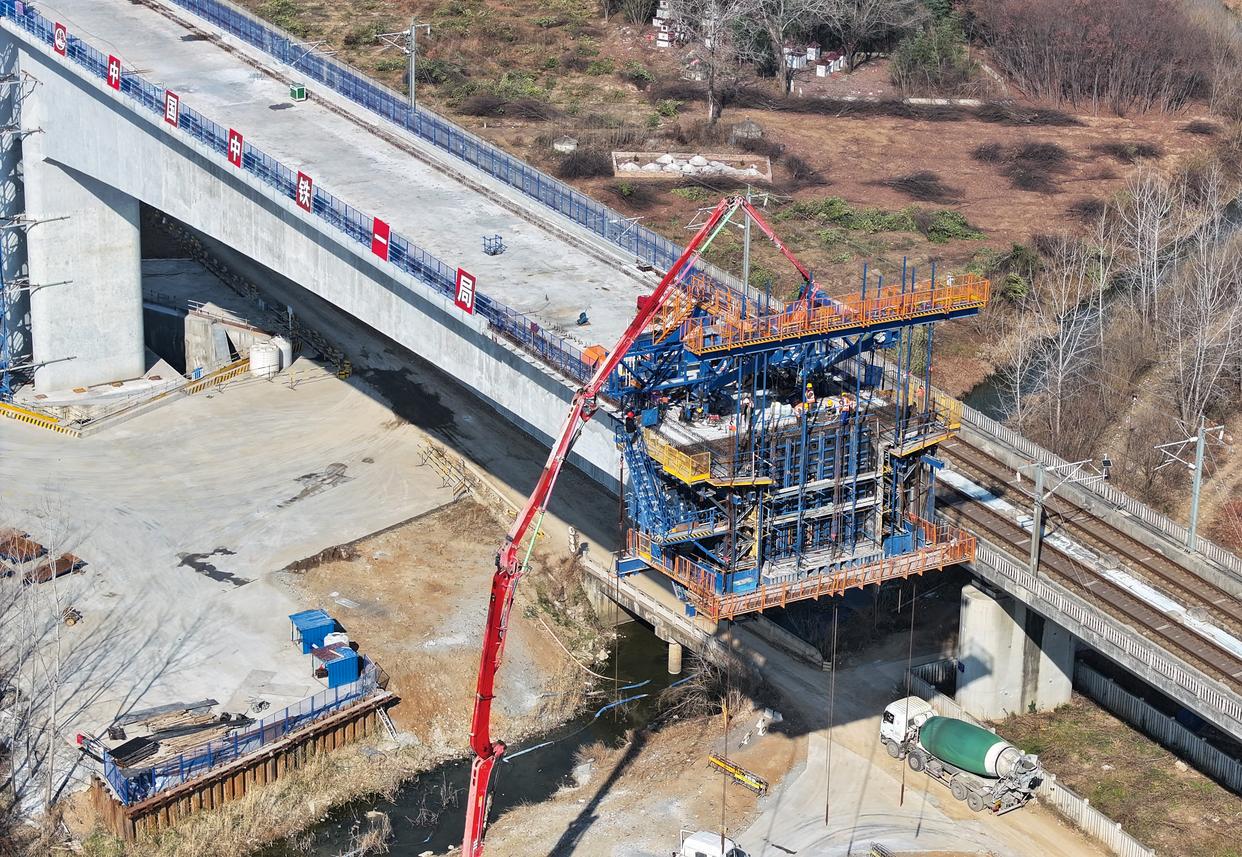 12月27日,由皖赣铁路安徽公司建设管理、中铁一局承建的沪宁合高铁跨京沪高铁立交特大桥201.5米预应力混凝土T构转体梁主体浇筑完成,为后续转体施工奠定了坚实基础。据悉,新建上海至南京至合肥高速铁路是国家中长期铁路网规划“八纵八横”中沿江通道的重要组成部分,是江北沿江城市与南京都市圈、上海都市圈快速直达的便捷通道。