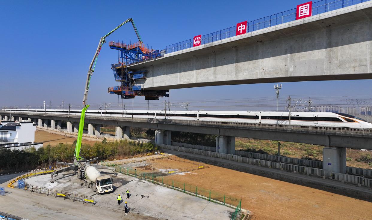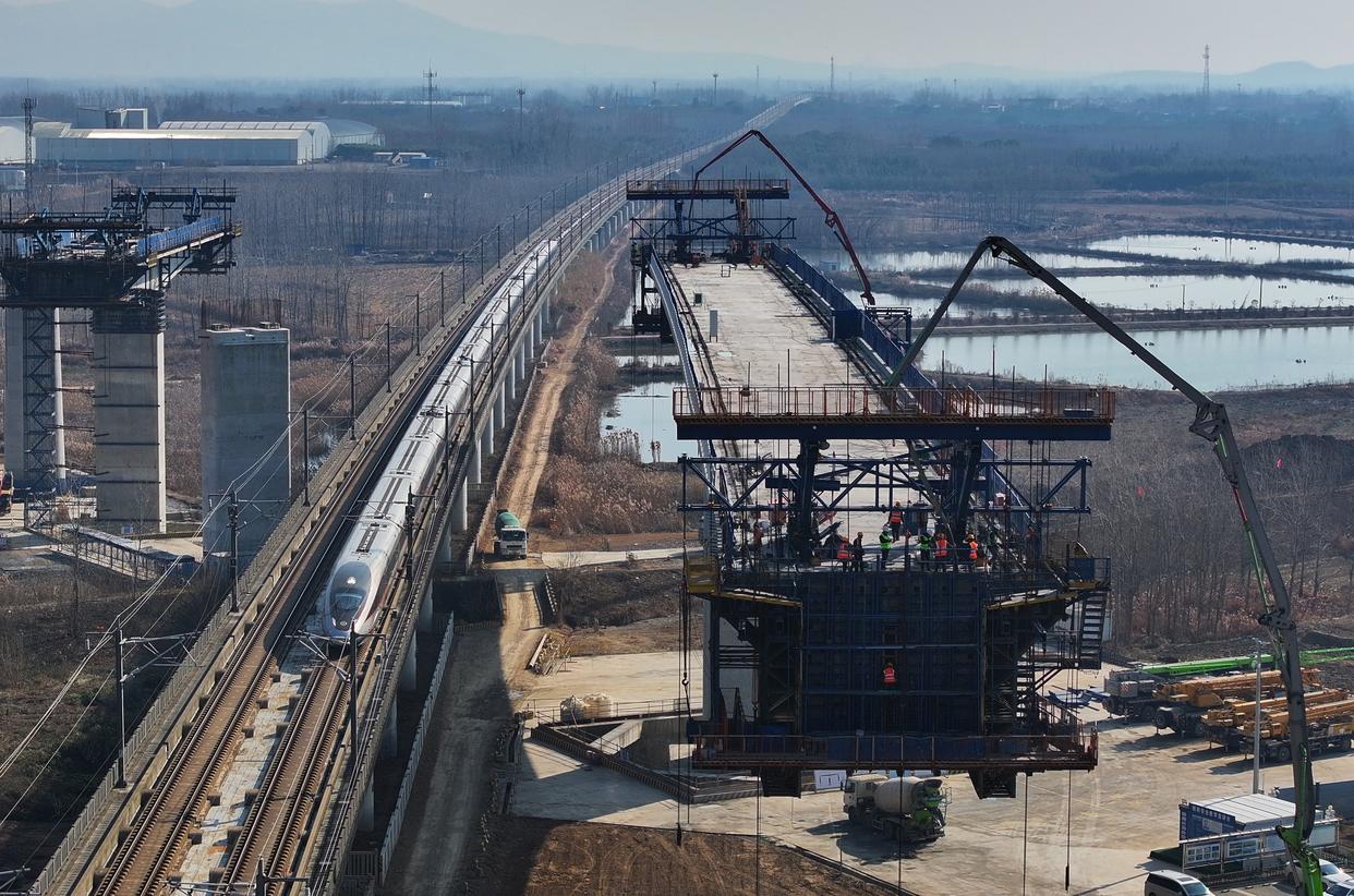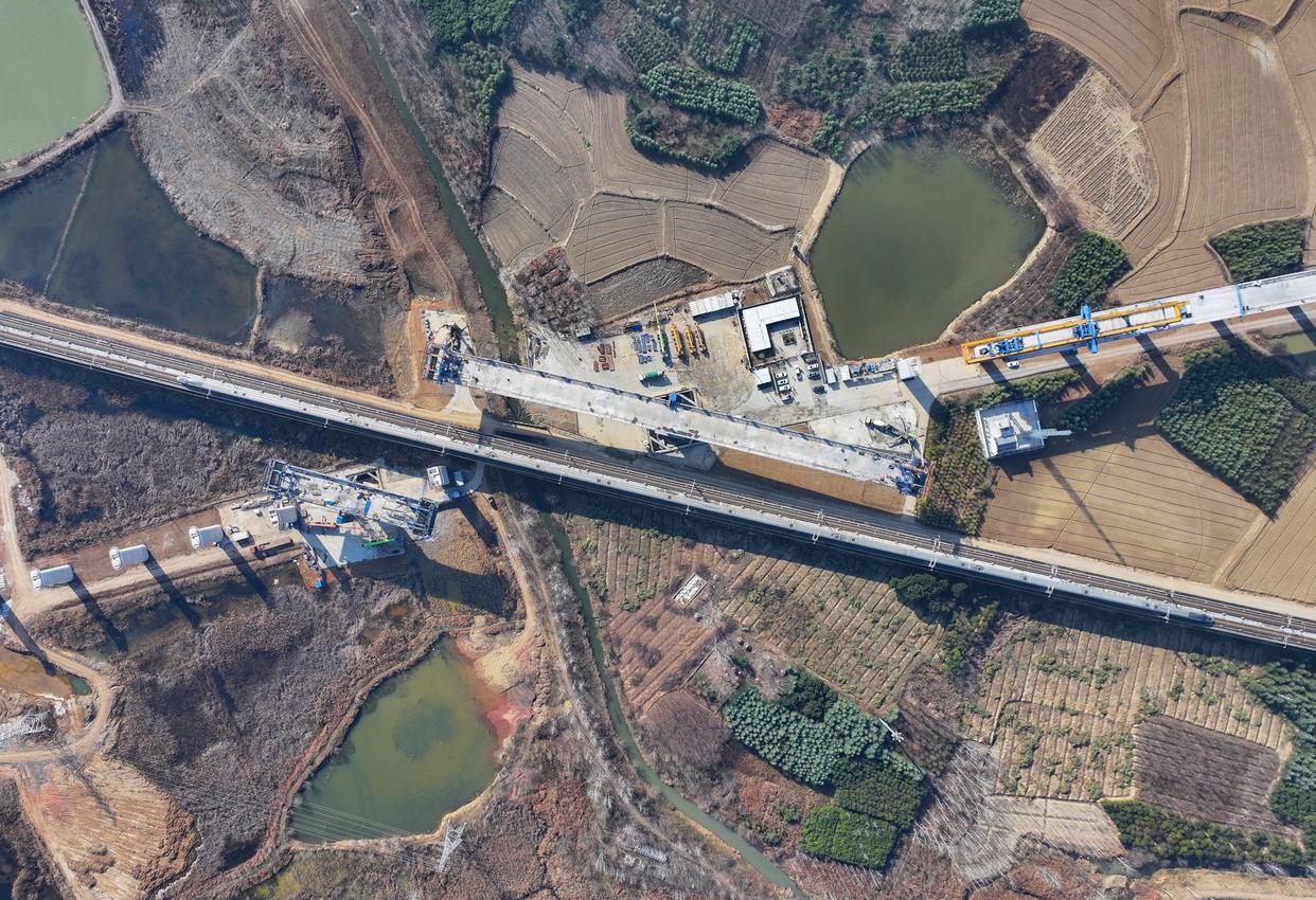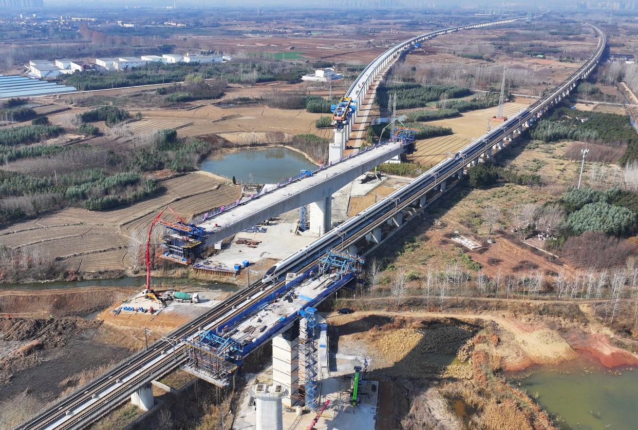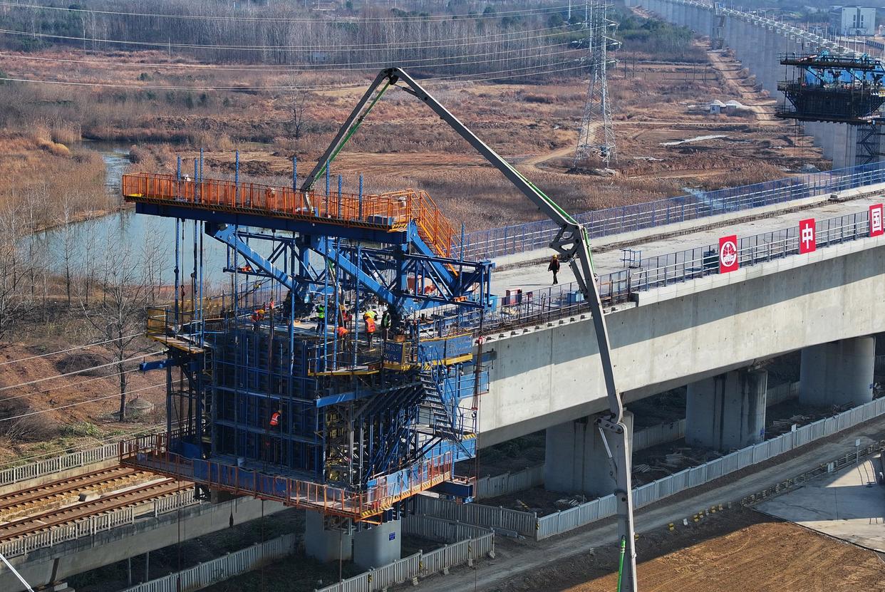 这是沪宁合高铁跨京沪高铁立交特大桥T构转体梁主体浇筑施工现场(12月27日摄,无人机照片)。新华社记者 杜宇 摄
