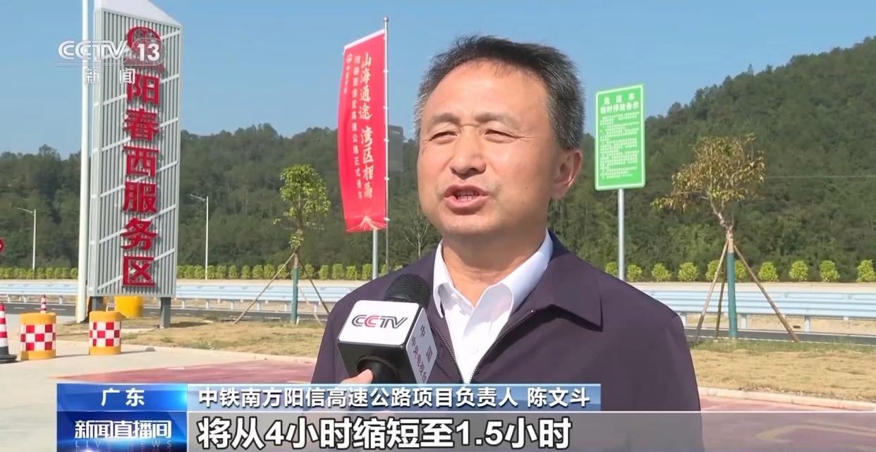 中铁南方阳信高速公路项目负责人 陈文斗:通车后,阳春至信宜的车程将从4小时缩短至1.5小时,信宜至深圳的车程也从5小时缩短至3小时。阳江、茂名北部山区的所有乡镇可实现半小时内上高速,有力推动高州荔枝、信宜三华李等粤西农特产品高效外运。