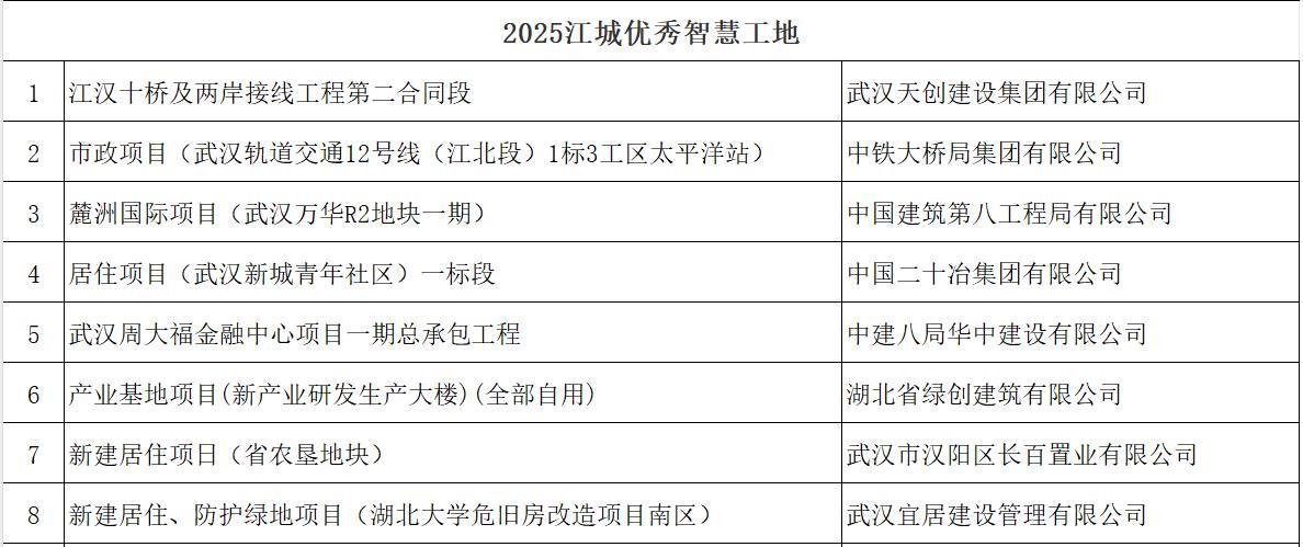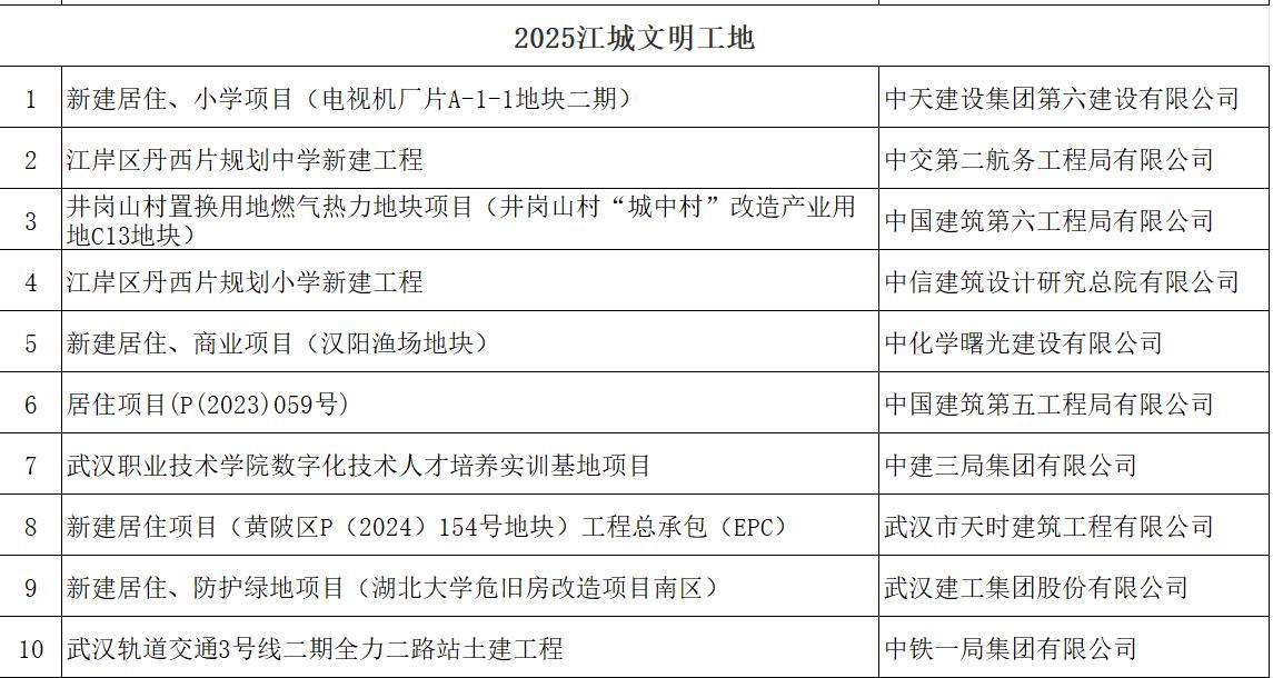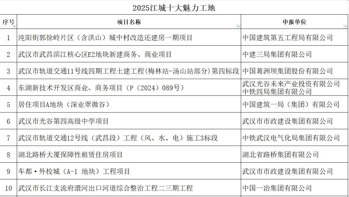 经综合审定,中建五局沌阳街郭徐岭片区(含洪山)城中村改造还建房一期项目等10个项目当选2025年“江城十大魅力工地”,还产生了10个“江城文明工地”;中建三局科创产业发展有限公司居住项目(中建壹品·汉韵公馆)等10个项目当选2025“江城十大智慧工地”,还产生了8个“江城优秀智慧工地”。