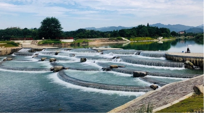 图为浙江金华梅溪河“溪口下堰”,堰坝设计融入了金华雅畈叠馒头祈福的寓意。新华网发