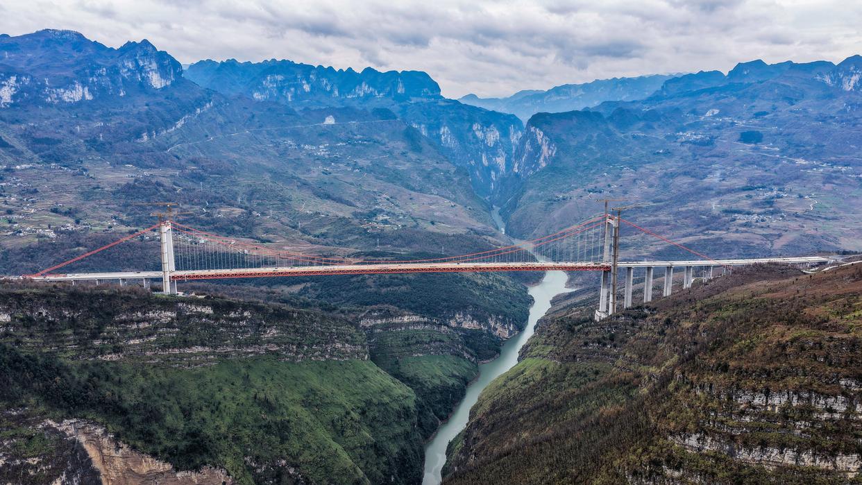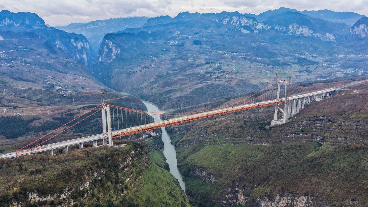 近日,贵州安(安顺)盘(盘州)高速天门特大桥主体工程顺利完工。天门特大桥是安顺至盘州高速公路的重要控制性工程,大桥全长1553米,桥面距离峡谷水面约560米。