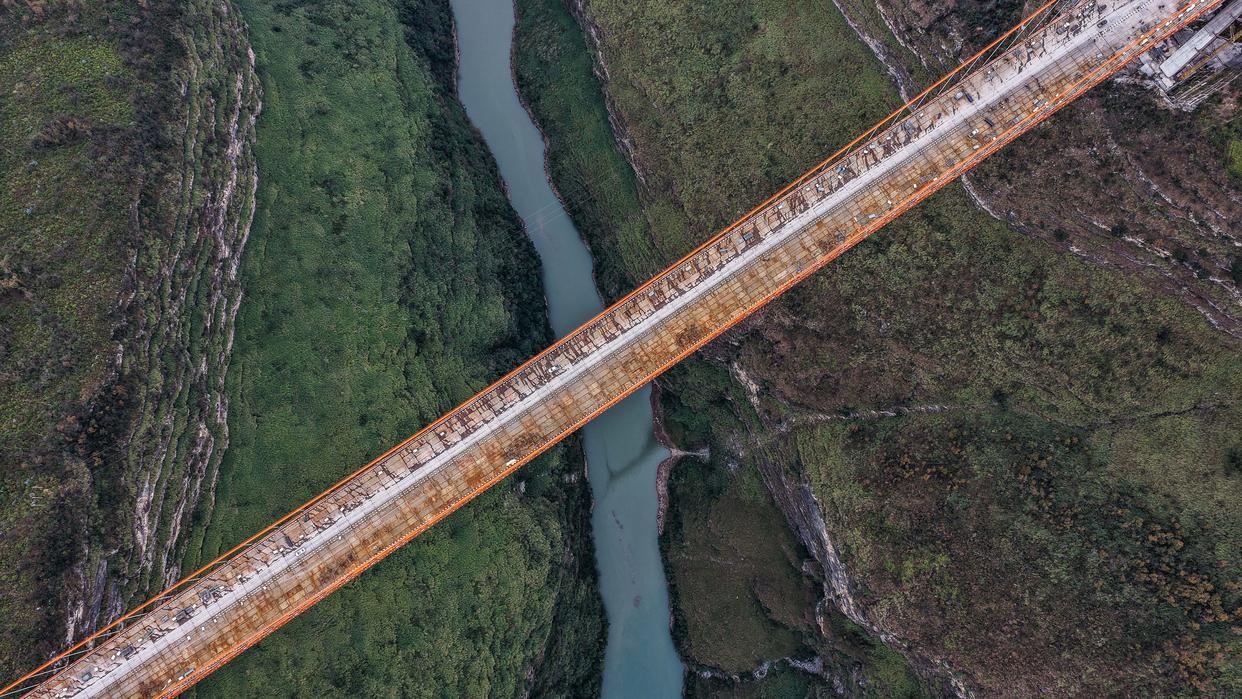 1月6日拍摄的主体工程已完工的安盘高速天门特大桥(无人机照片)。新华社记者 陶亮 摄