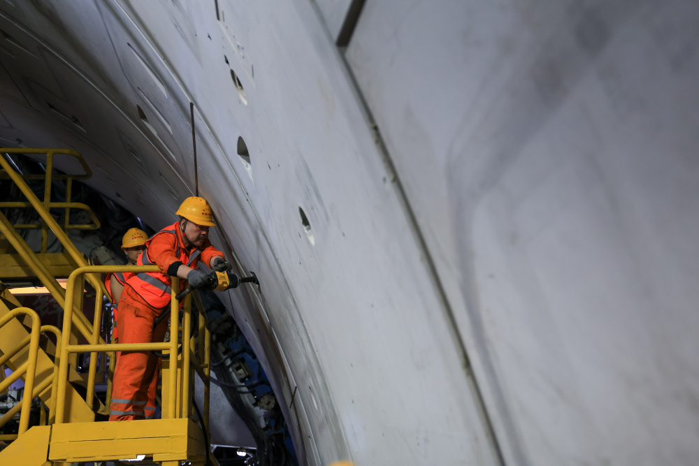 1月6日,中铁十四局施工人员在“深江1号”盾构机上进行管片螺栓紧固工作。新华社记者 毛思倩 摄