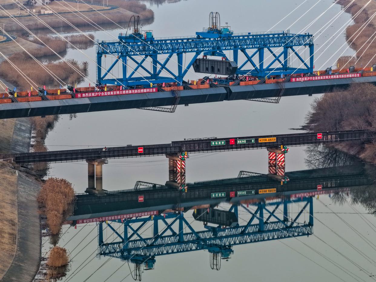 这是1月8日拍摄的沪宁合高铁南京特大桥跨滁河斜拉桥合龙施工现场(无人机照片)。新华社记者 李博 摄