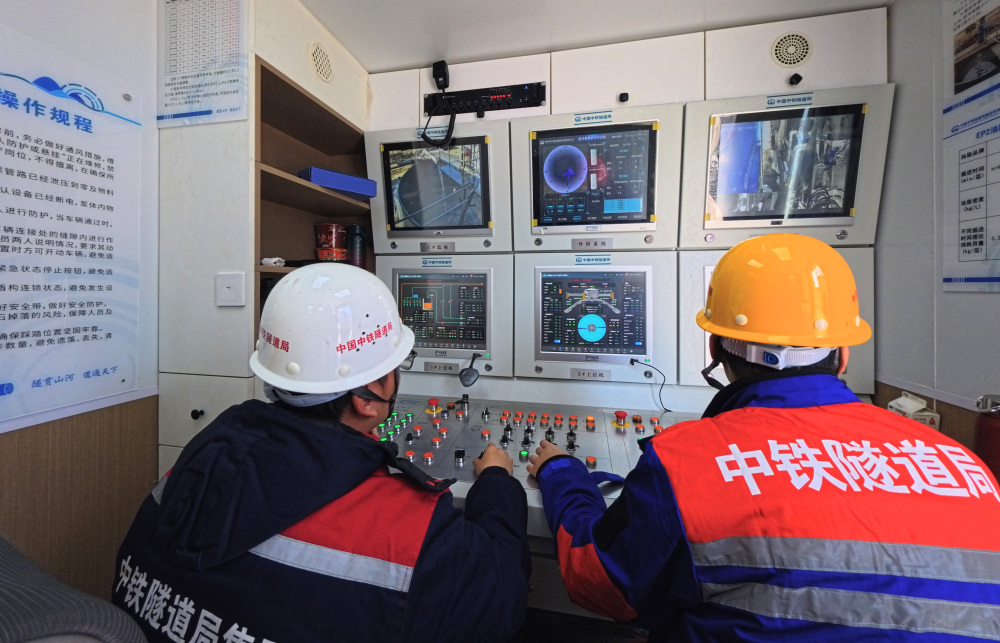 1月13日,技术人员在“启明号”竖井掘进机控制室内监测运行情况。新华社记者 方喆 摄