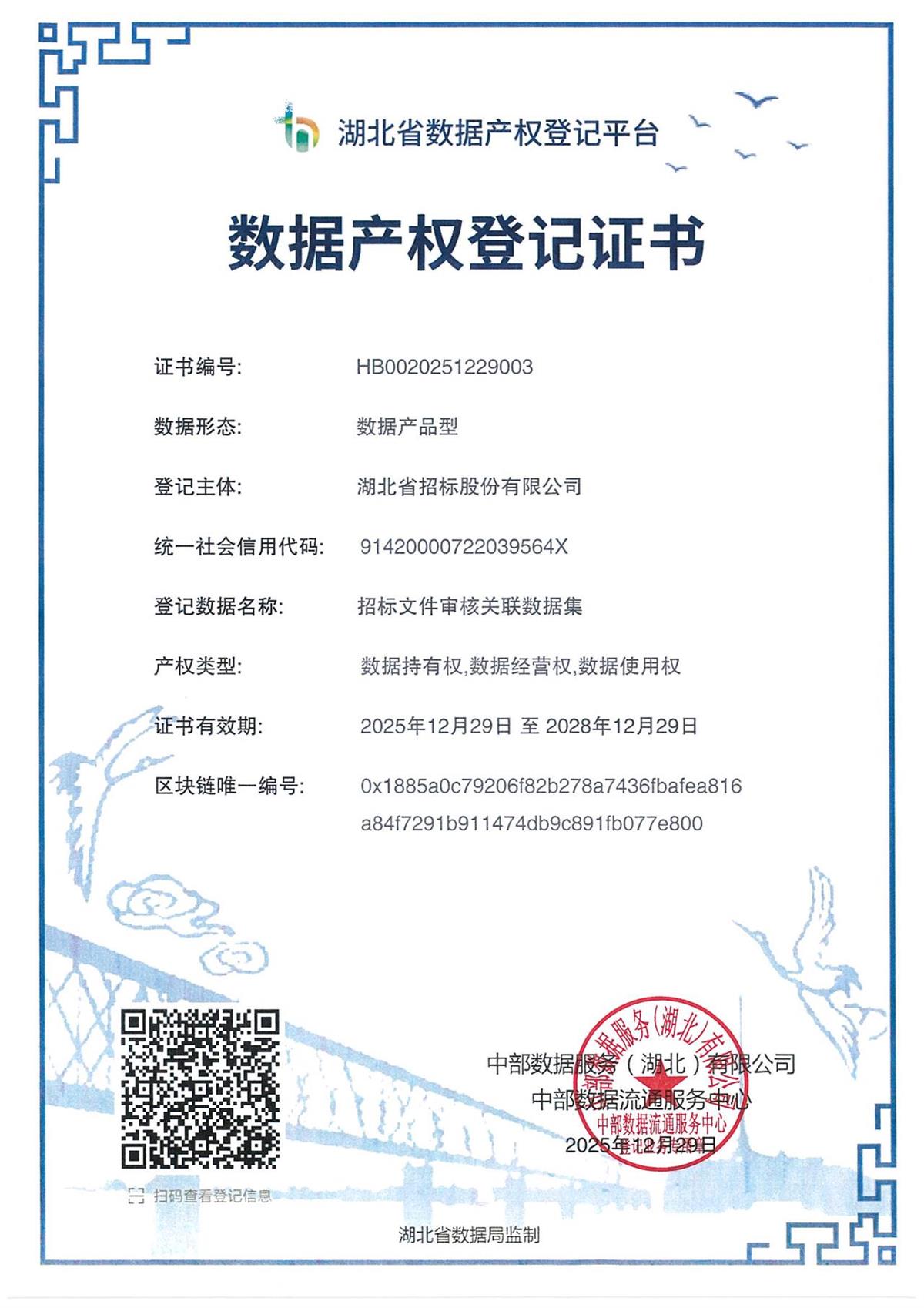 据了解,湖北省招标采购领域首例数据资产入表的案例成果,是由湖北省招标股份有限公司研发的“招标文件审核关联数据集”数据产品,该产品经数据资源盘点、资产识别、合规确权、成本归集、审计确认等关键环节完成数据资产入表,取得《数据产权登记证书》《数据资产登记证书》及《交易标的登记证书》等5项权威认证,并在湖北省数据流通交易平台正式挂牌上架,为全国招采领域数据资产化实践树立新标杆。