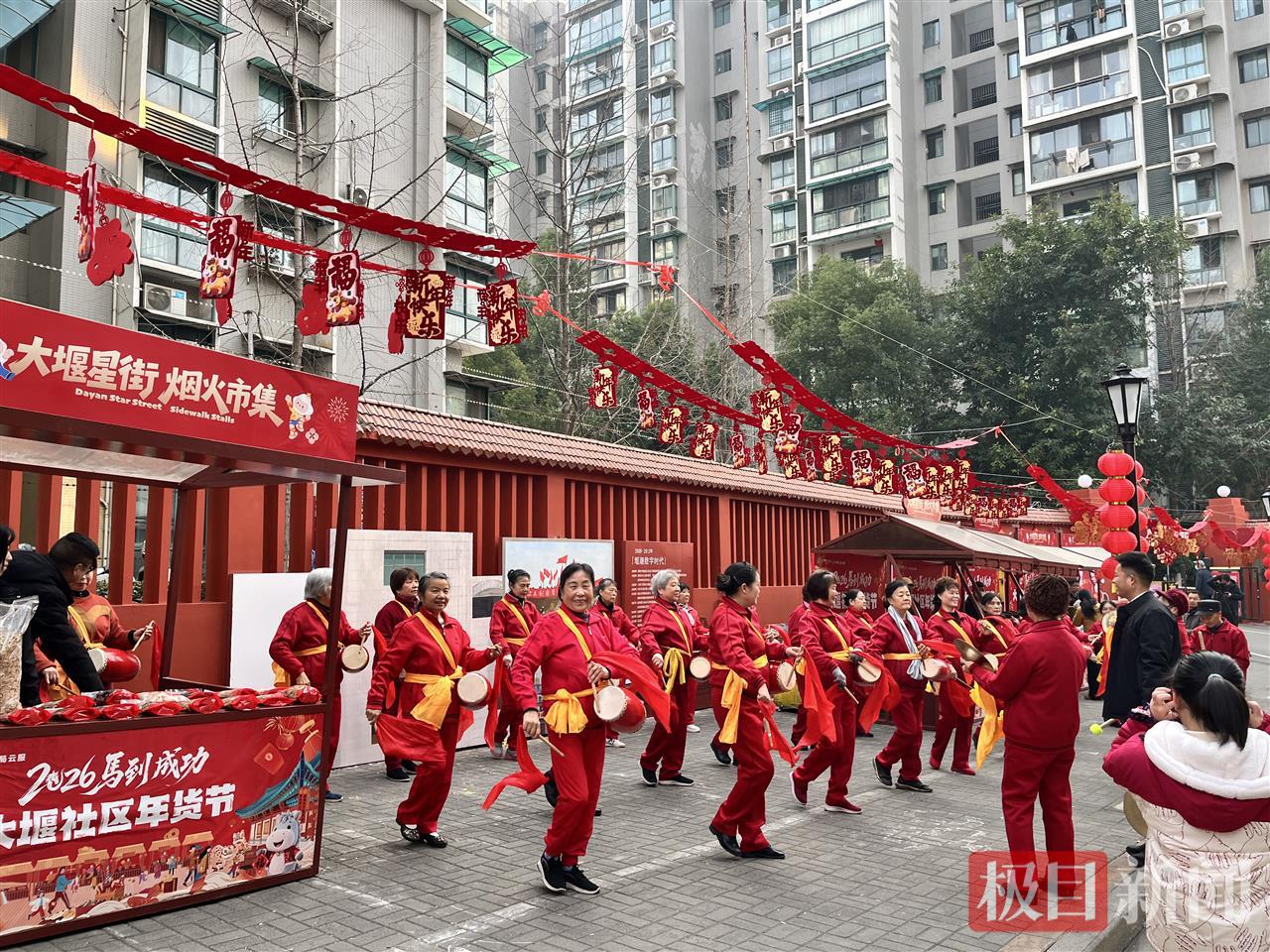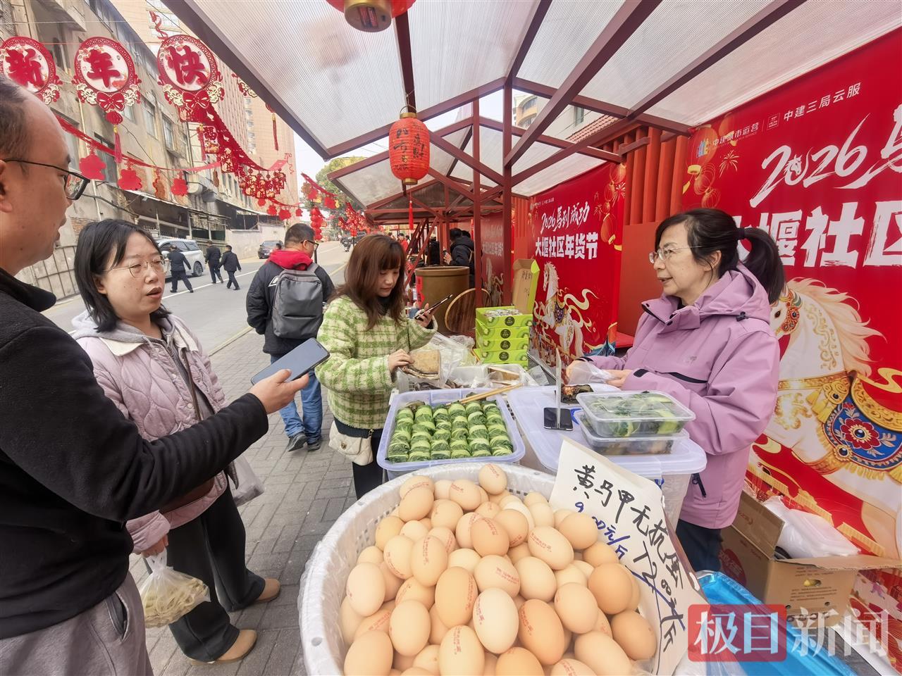 该活动由刘家大堰社区居委会主办,中建三局城市投资运营公司、湖北文旅宜昌集团、湖北拾光里康养公司联合承办。在年货节现场,20余个市集摊位整齐排列,春联灯笼、土家农产品、山西老陈醋等商品琳琅满目,“财神”带着社区锣鼓队为大家献上精彩表演和游街互动,让市民沉浸式感受传统年俗魅力。