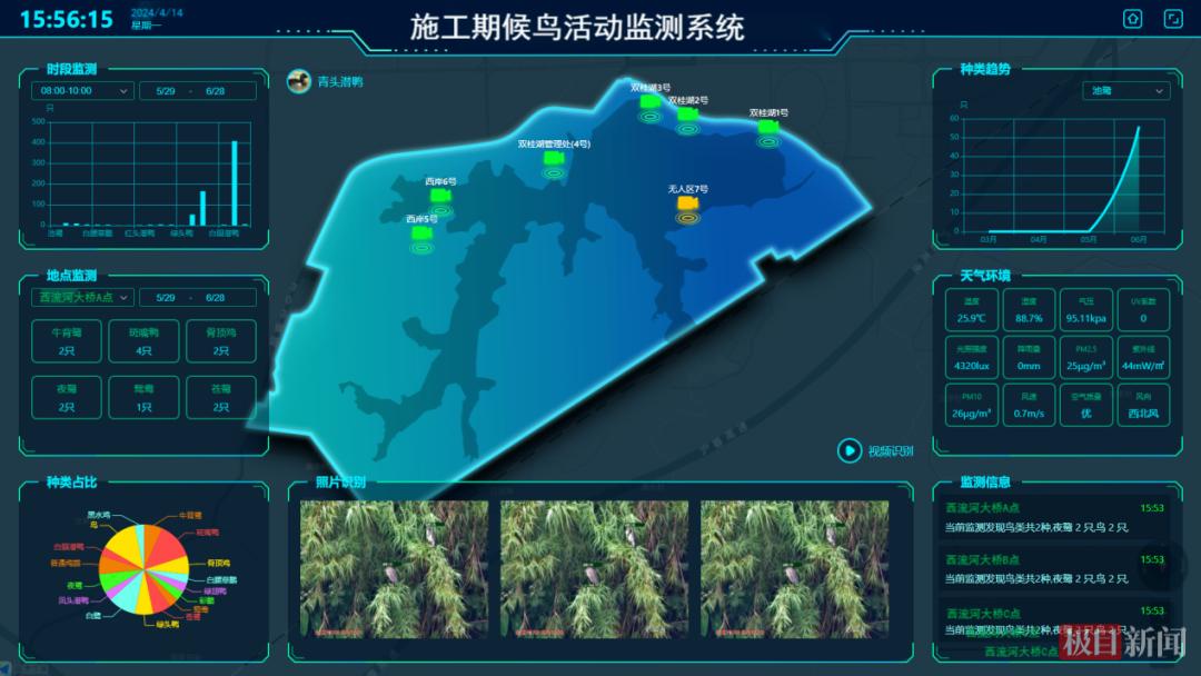 绿色环保展区:针对沉湖湿地生态保护需求,建立鸟类迁徙期、鱼类产卵期动态监测机制。研发基于人工智能的候鸟活动监测系统,利用高清摄像头、声音传感器和AI算法监测鸟类聚集或敏感行为。通过水质监测设备采集水温等关键信息,并针对性调整施工计划,确保工程建设与自然环境和谐共存。