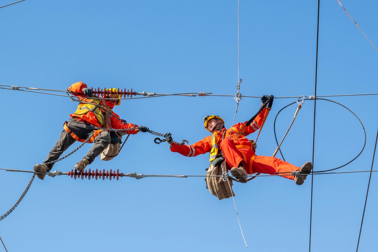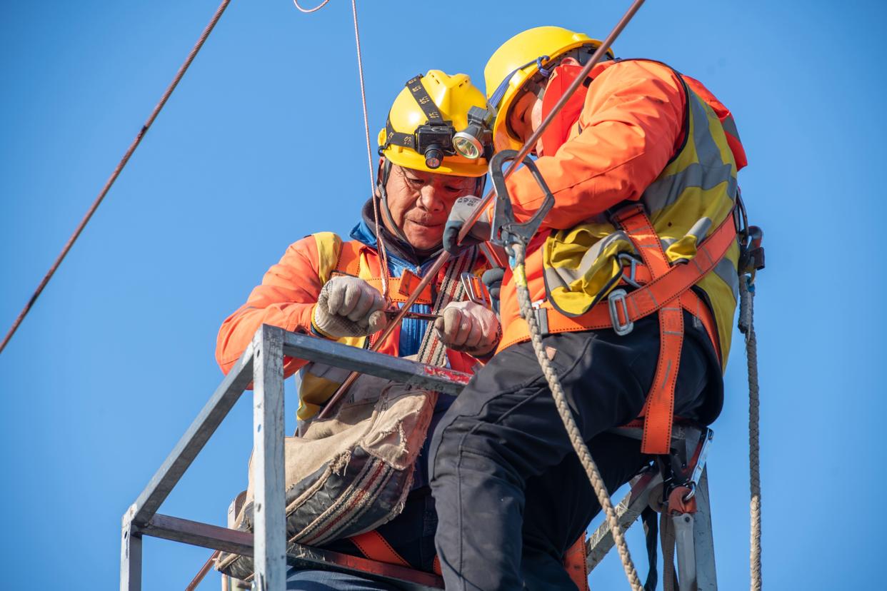 1月22日,在位于江苏省南京市浦口区的京沪线林场站,铁路供电职工在进行接触网施工作业。新华社发(吴昊 摄)