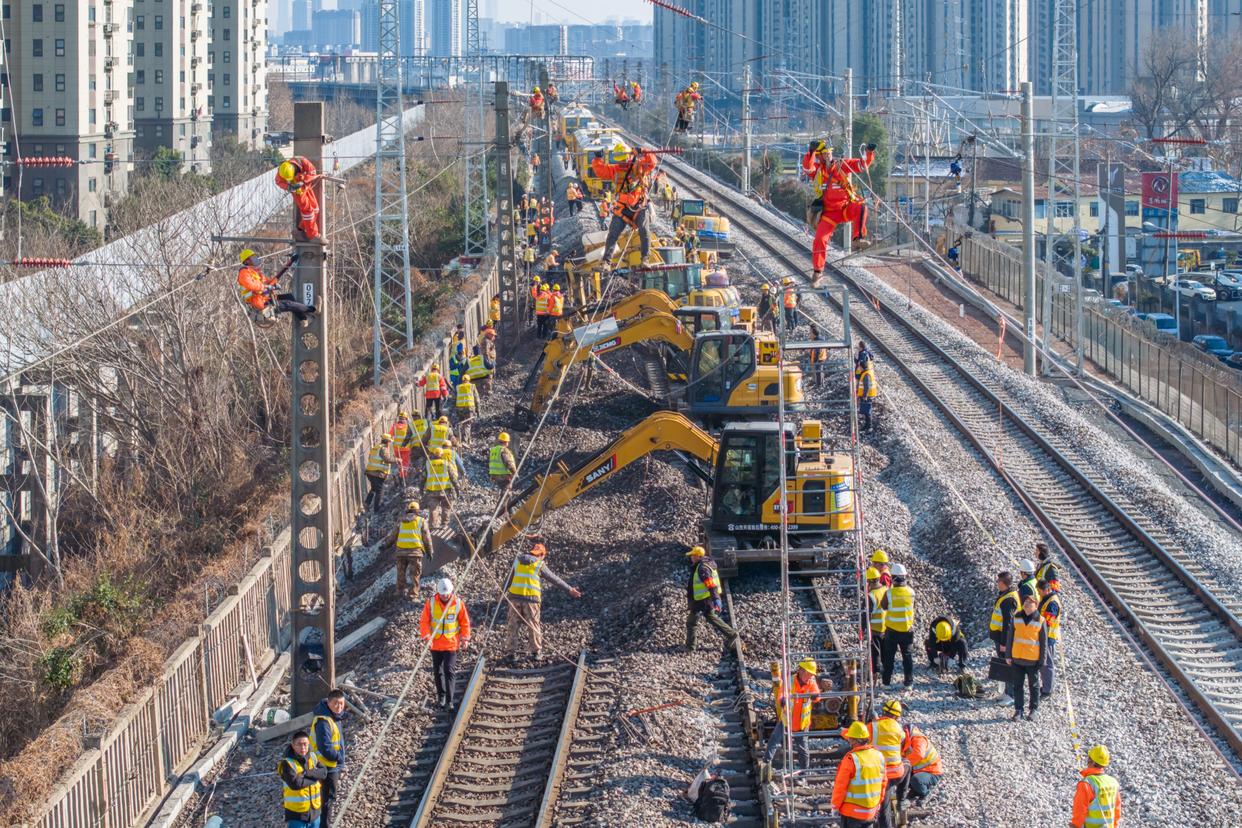 1月22日,在位于江苏省南京市浦口区的京沪线林场站,铁路工务、供电、电务等专业的职工在进行联合封锁施工作业。新华社发(吴昊 摄)