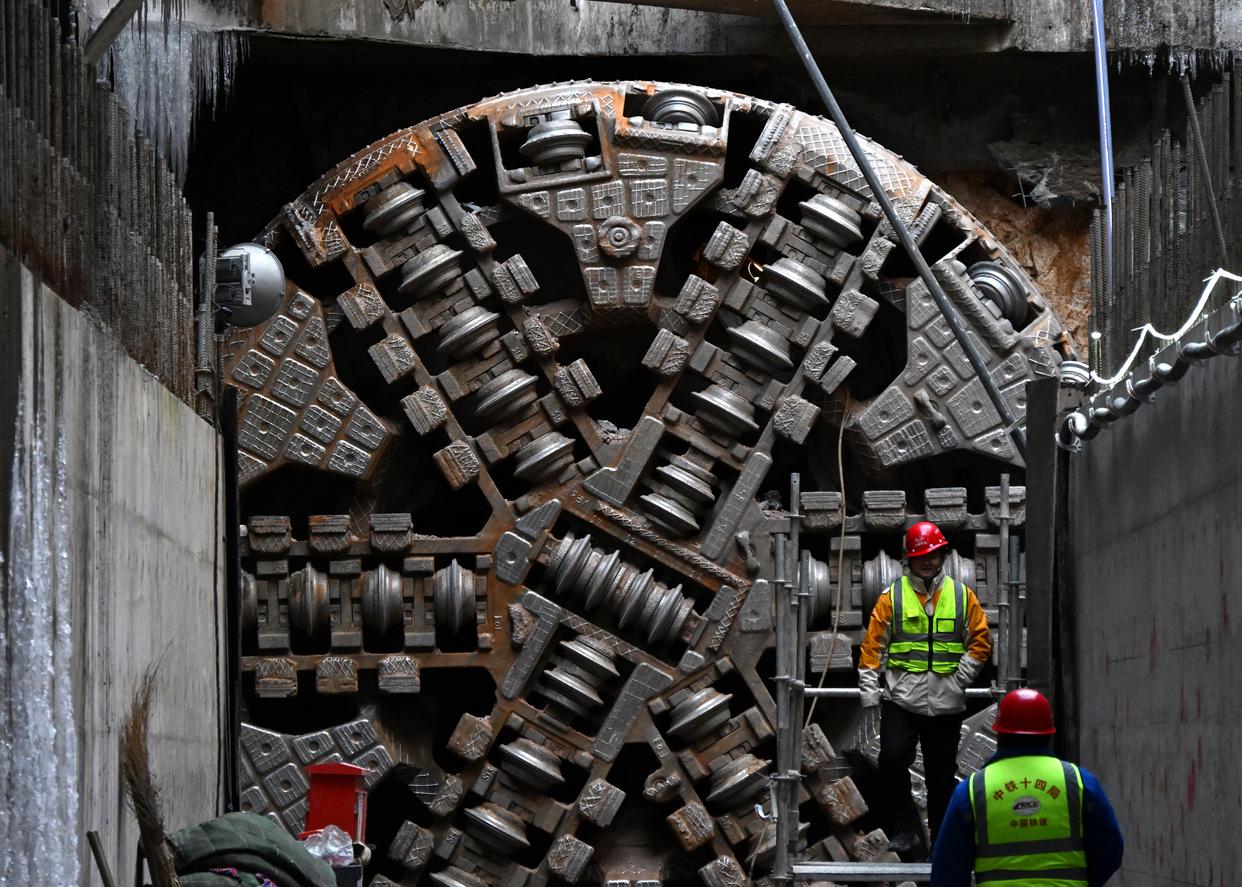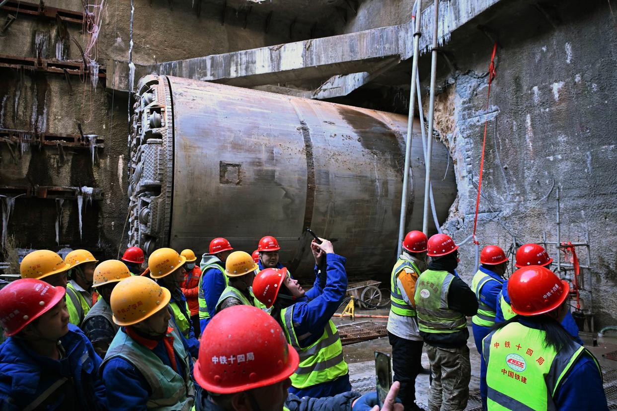 1月21日,建设者在青岛地铁5号线四方厂站接收井等待右线贯通。新华社记者 李紫恒 摄