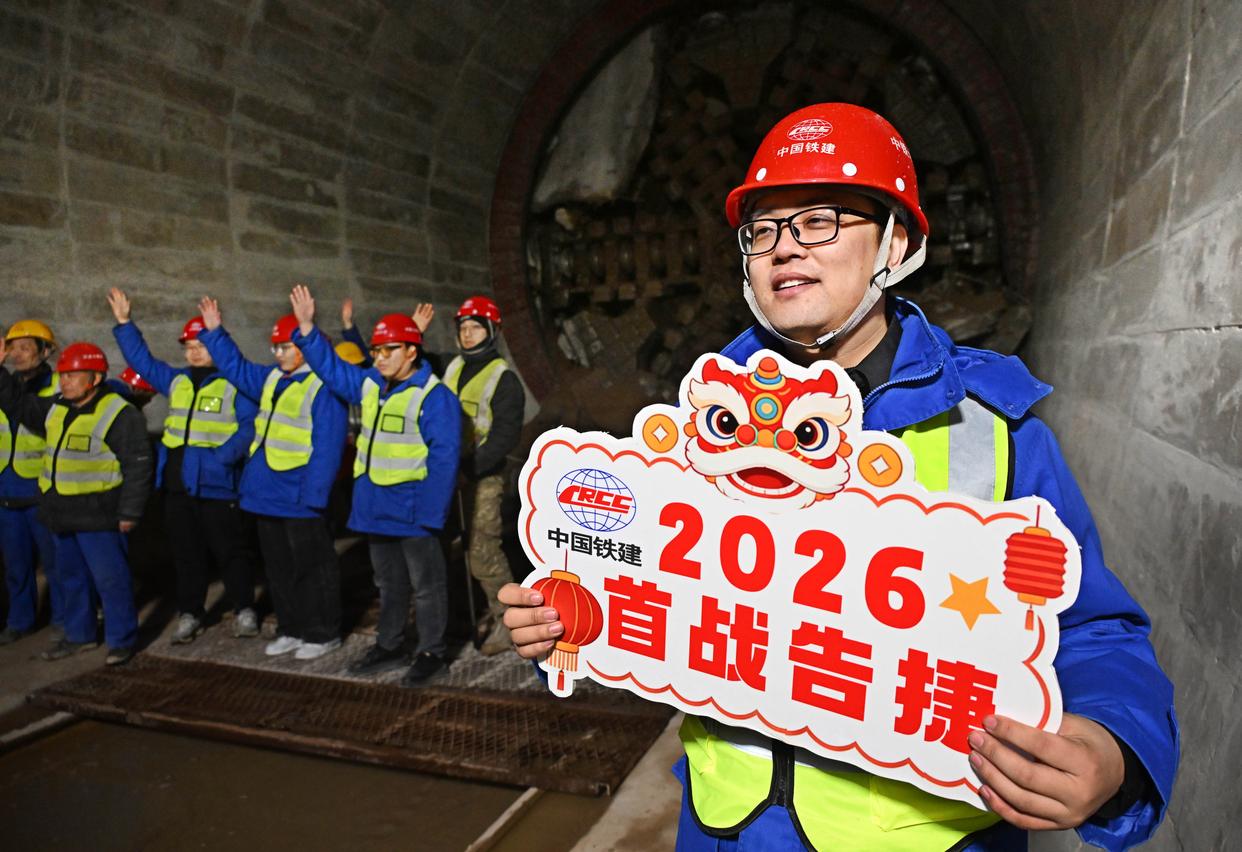 1月21日,中铁十四局建设者在庆祝青岛地铁5号线瑞昌路站—四方厂站区间双线贯通。新华社记者 李紫恒 摄