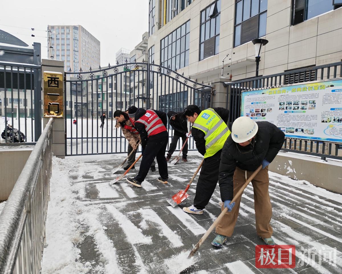 武汉光谷万象天地项目积极组建青年突击队,党员带头响应,各分包单位协同配合,对接街道城管及周边学校,对项目附近地铁口、学校出入口及主干道开展积雪清扫,并提前储备工业盐、编织袋等应急物资,有效防止道路结冰。