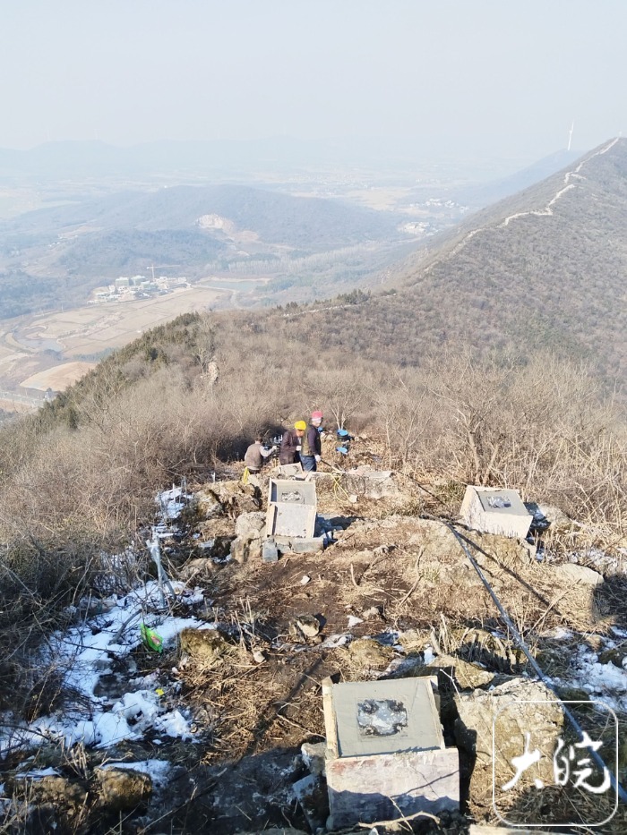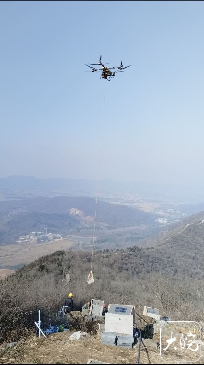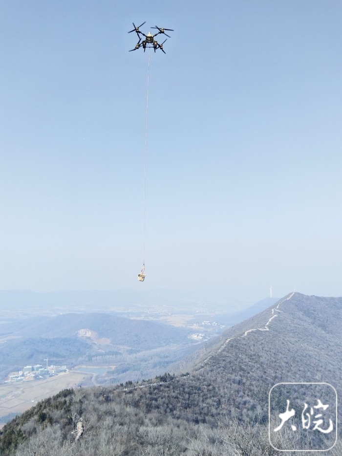 大皖新闻记者在现场看到,最引人注目的是空中往来穿梭的无人机,它悬挂绳索,将建材一趟趟吊运到山顶工地,提高了效率。许多市民在附近围观无人机运输材料,当无人机吊运着建材飞越山川时,人群中便传来阵阵惊叹。“你看,来了!来了!”一位市民兴奋地指向正在空中运输建材的无人机说。