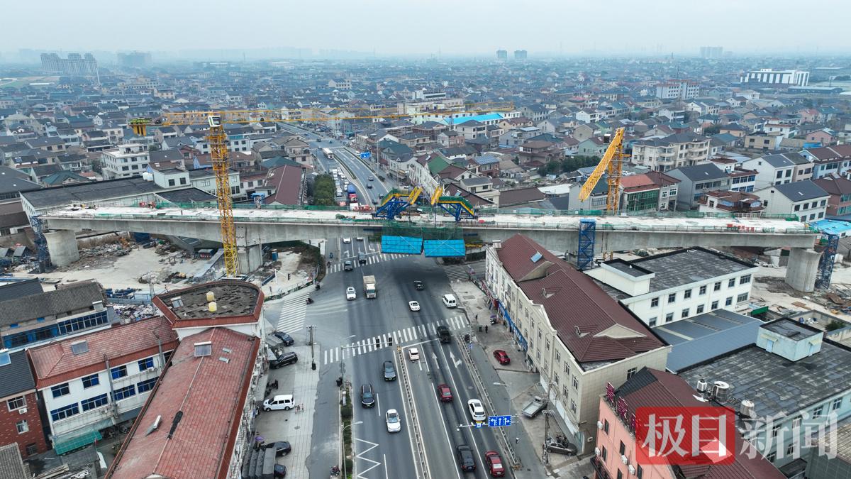 此次合龙的跨芦庵公路连续梁全长178.95米,共3跨,最大跨径达80米,桥面宽12.6米,截面高度由6.64米向3.84米渐变过渡,采用挂篮对称悬浇施工,分10个节段完成,累计浇筑混凝土约2950立方米,使用钢筋约512吨。该连续梁位于芦庵公路、沧庵路和沧大公路交叉口,施工期间面临车流量大、作业面紧邻路口与民房、安全管控难度高等挑战。