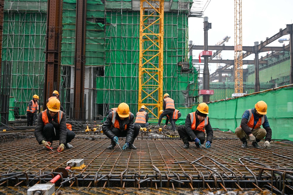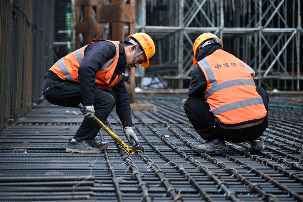 1月30日,中铁建设集团工人在南京北站建设现场绑扎钢筋。新华社记者 季春鹏 摄