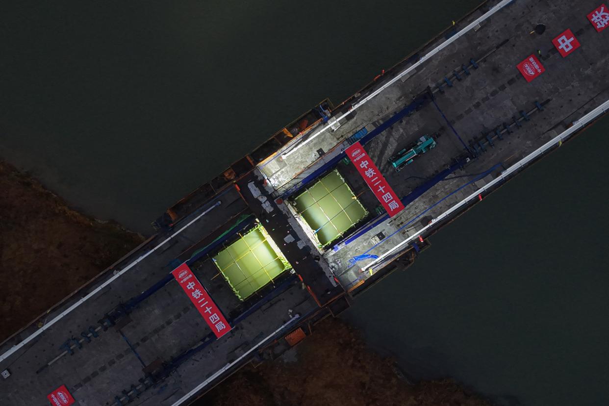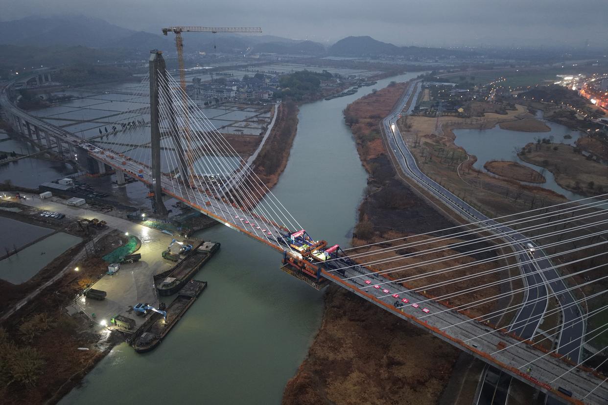 1月30日,中铁二十四局建设者在杭州至德清市域铁路跨东苕溪斜拉桥合龙施工现场作业。新华社记者 黄宗治 摄