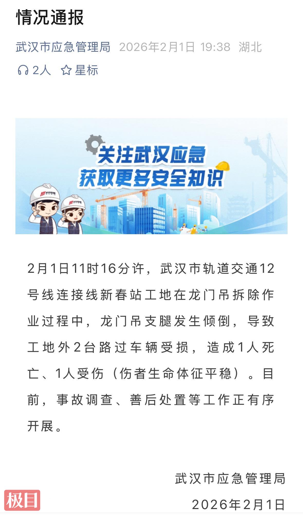 2月1日19时38分,武汉市应急管理局发布情况通报。通告内容如下:2月1日11时16分许,武汉市轨道交通12号线连接线新春站工地在龙门吊拆除作业过程中,龙门吊支腿发生倾倒,导致工地外2台路过车辆受损,造成1人死亡、1人受伤(伤者生命体征平稳)。目前,事故调查、善后处置等工作正有序开展。