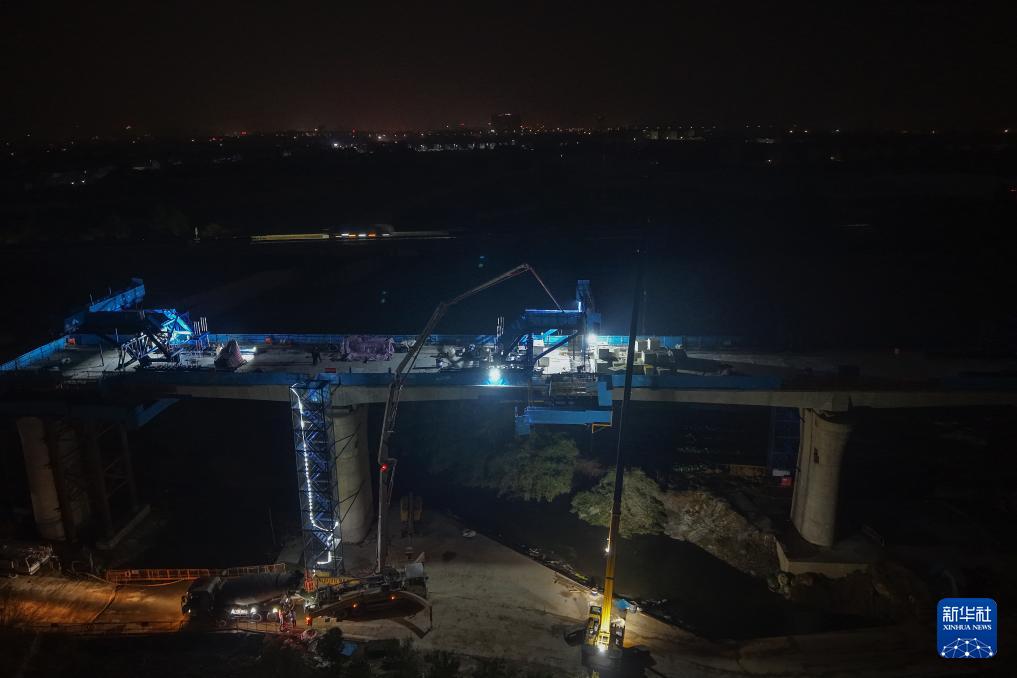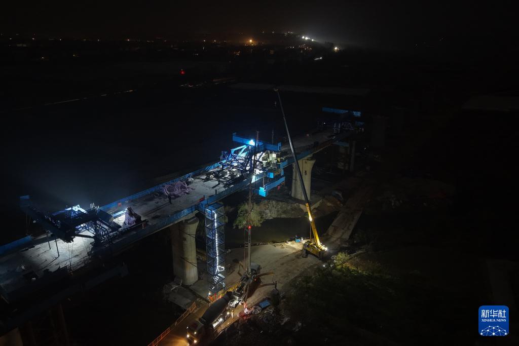 2月3日凌晨拍摄的衢丽铁路衢江特大桥跨芝溪连续梁合龙施工现场(无人机照片)。新华社记者 黄宗治 摄