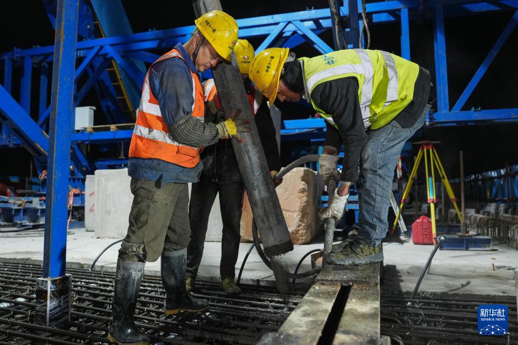2月3日凌晨,建设者在衢丽铁路衢江特大桥跨芝溪连续梁合龙施工现场作业。新华社记者 黄宗治 摄