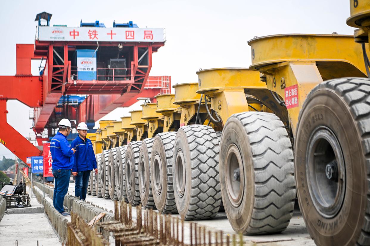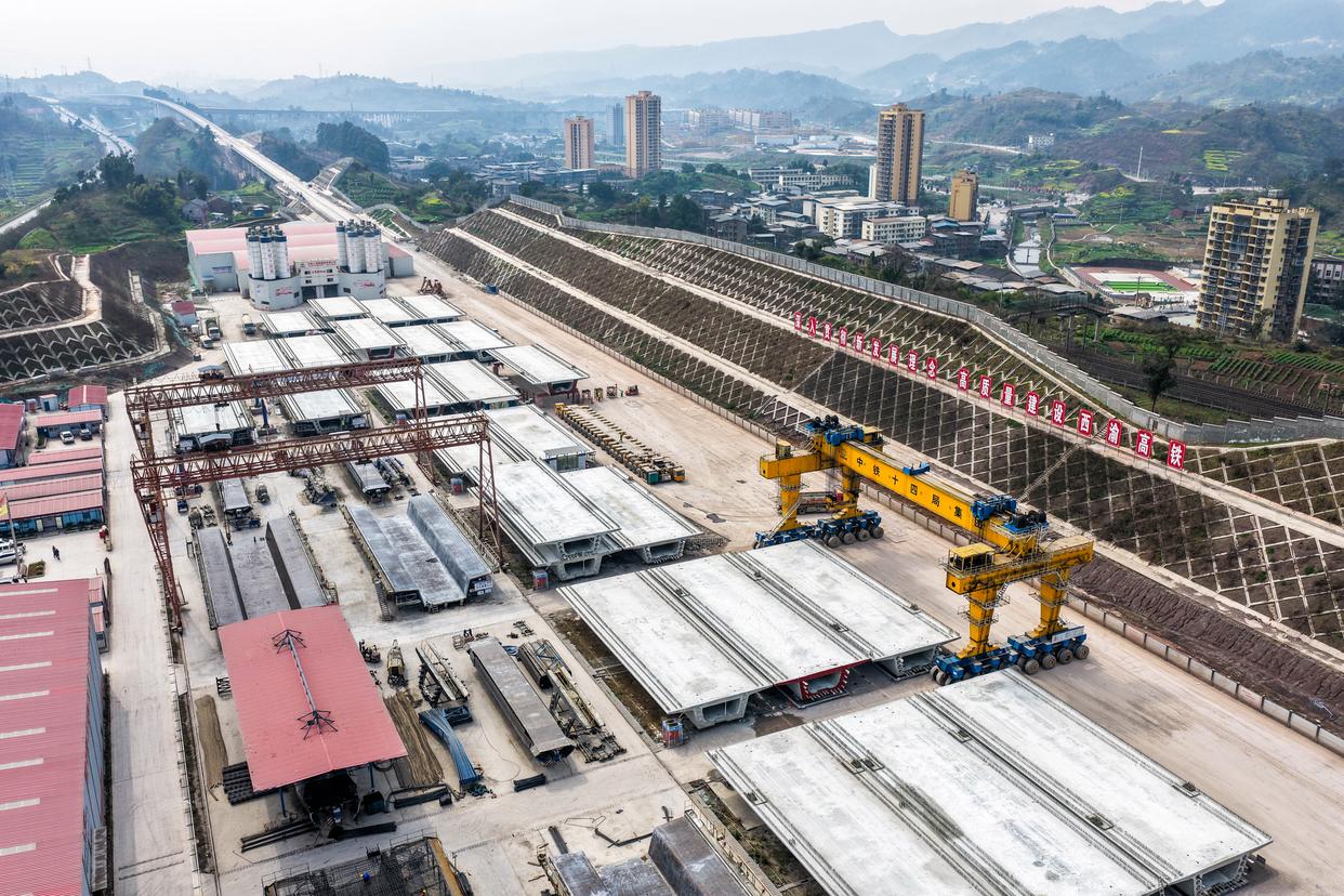 2月26日,在西渝高铁合川东制梁场,大型机械在进行提梁、运梁作业(无人机照片)。新华社记者 唐奕 摄