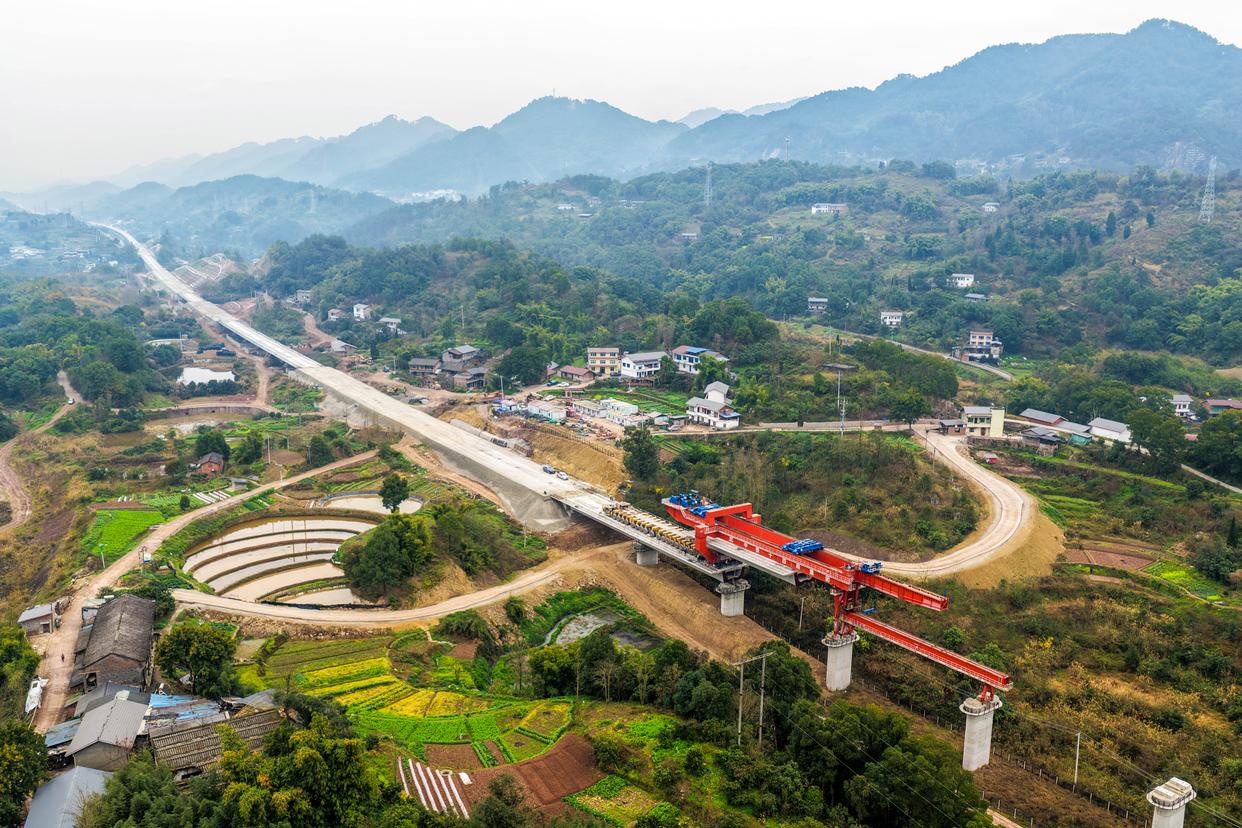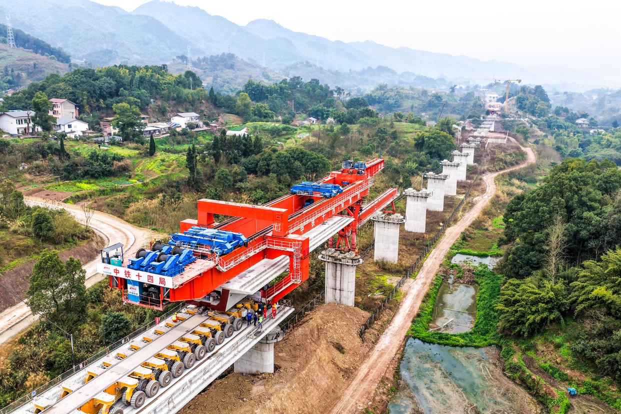 2月26日,在重庆市合川区清平镇的西渝高铁建设工地,架梁机在进行架梁作业(无人机照片)。新华社记者 唐奕 摄