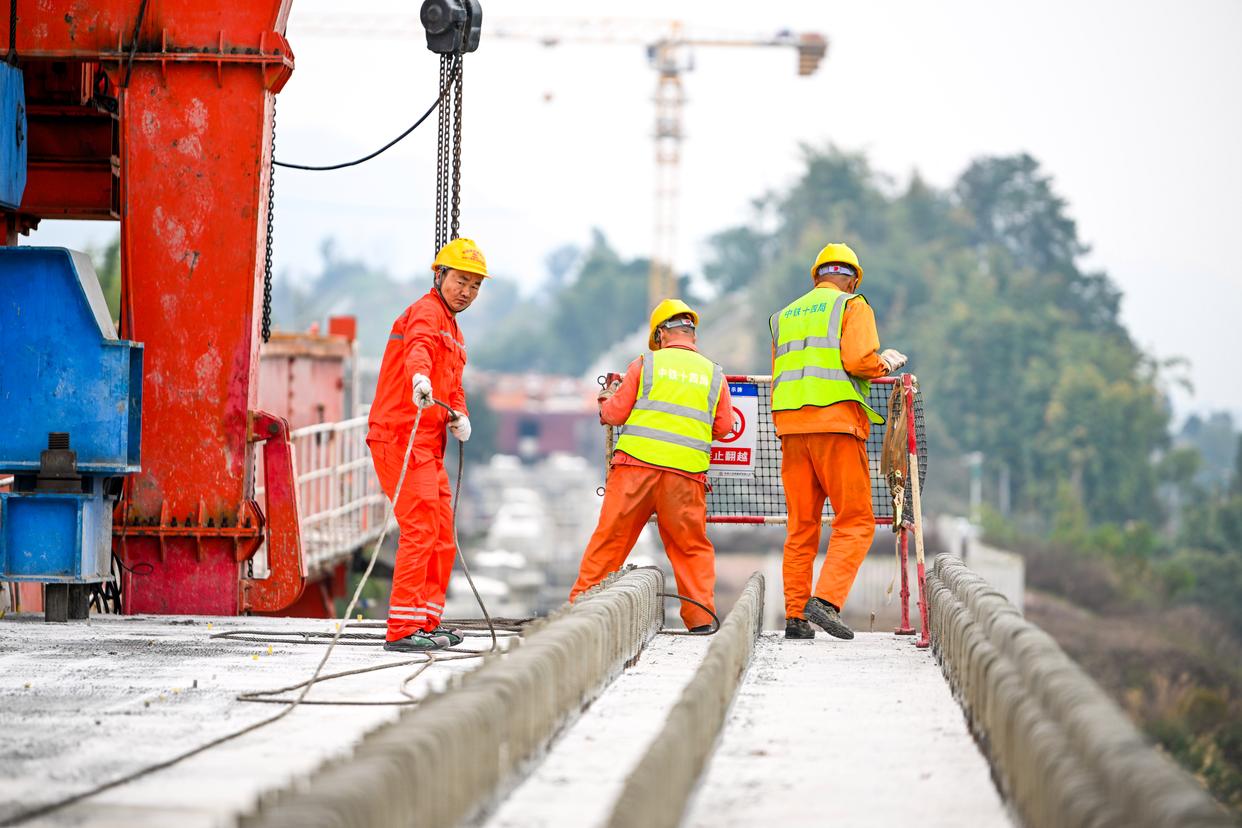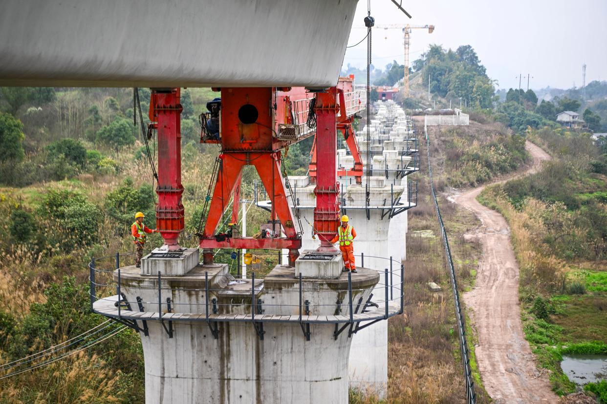 2月26日,在重庆市合川区清平镇的西渝高铁建设工地,工人在进行架梁作业。新华社记者 唐奕 摄