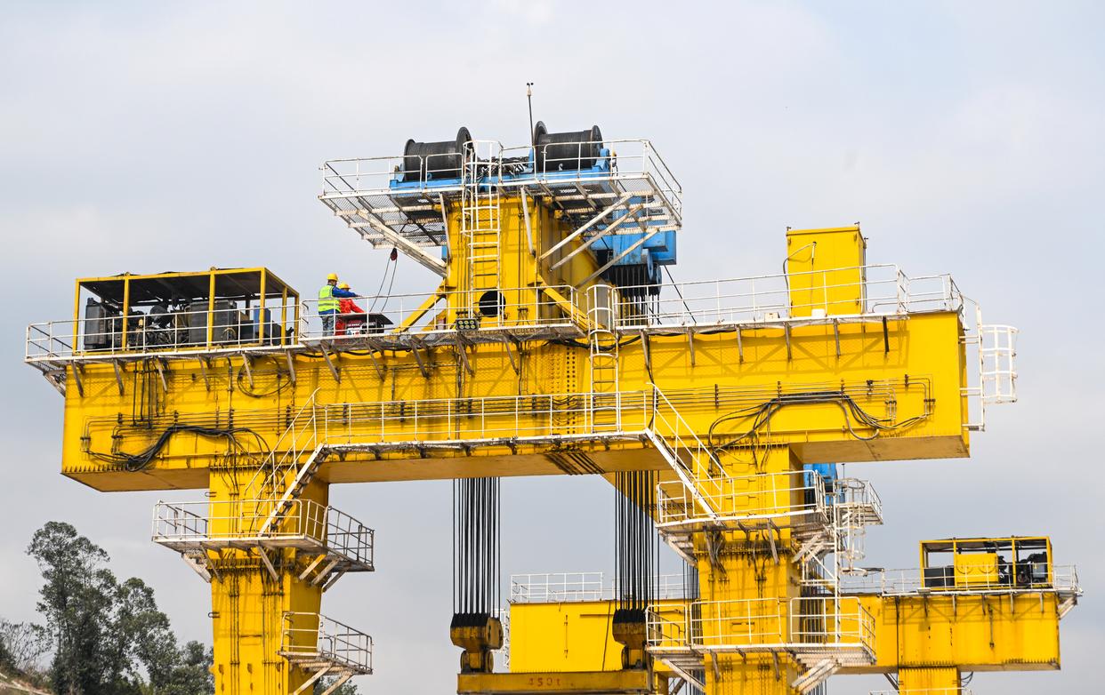 2月26日,在西渝高铁合川东制梁场,工人在提梁机上进行作业前的准备工作。新华社记者 唐奕 摄