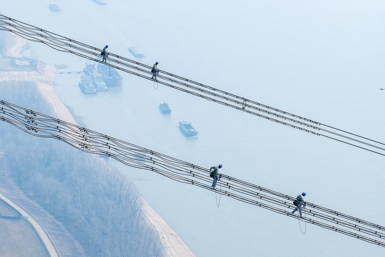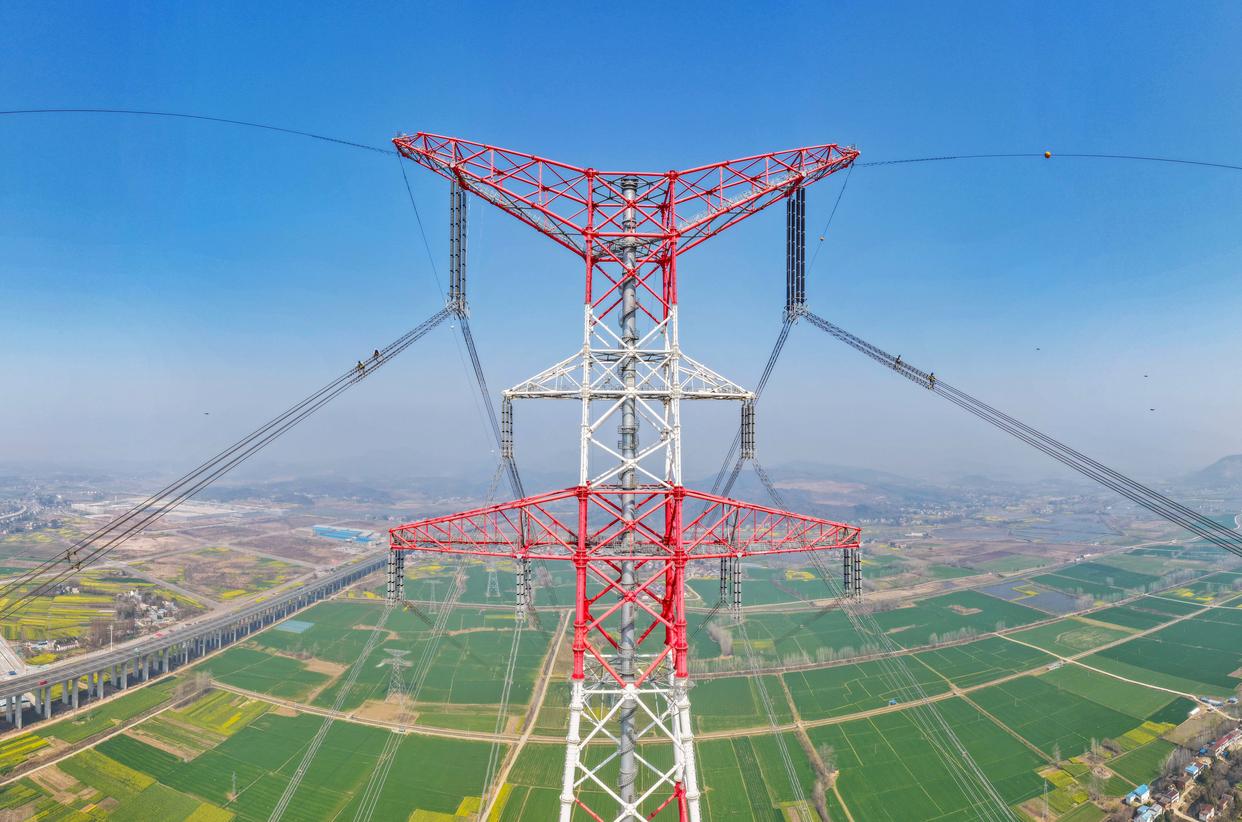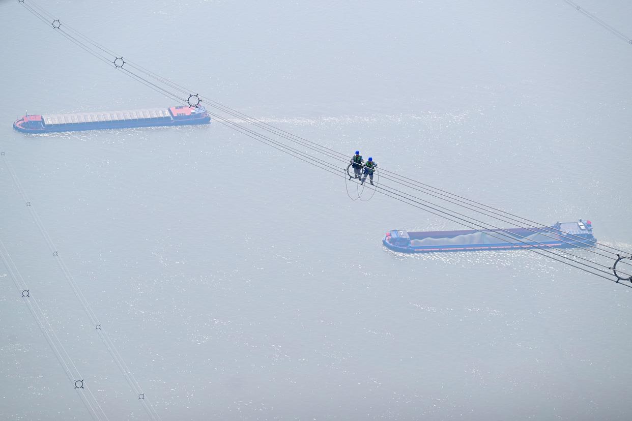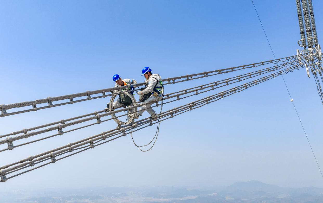 近日,我国“西电东送”重要通道——±800千伏特高压金塘线启动全面检修。在安徽省铜陵市枞阳县长江边,检修工人穿戴专业防护设备,在最高达345米的特高压输电线路上攀爬走线、精心作业,保障输电线路安全。