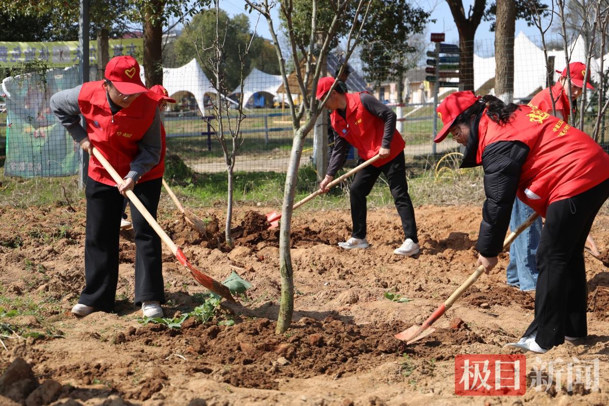 活动中,大家几人一组,分工协作,挥锹铲土、扶苗填坑,现场呈现出一派热火朝天的忙碌景象。经过近一个小时的辛勤劳作,一株株新栽种的树苗迎风挺立,为初春的梁子湖畔增添了勃勃生机。种植完成后,大家纷纷在认养的树苗上悬挂专属铭牌,写下绿色寄语,记录下这充满意义的时刻。