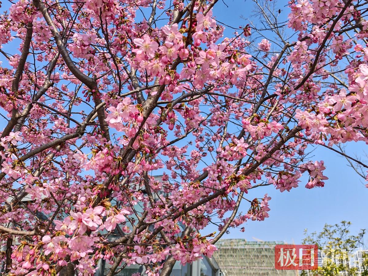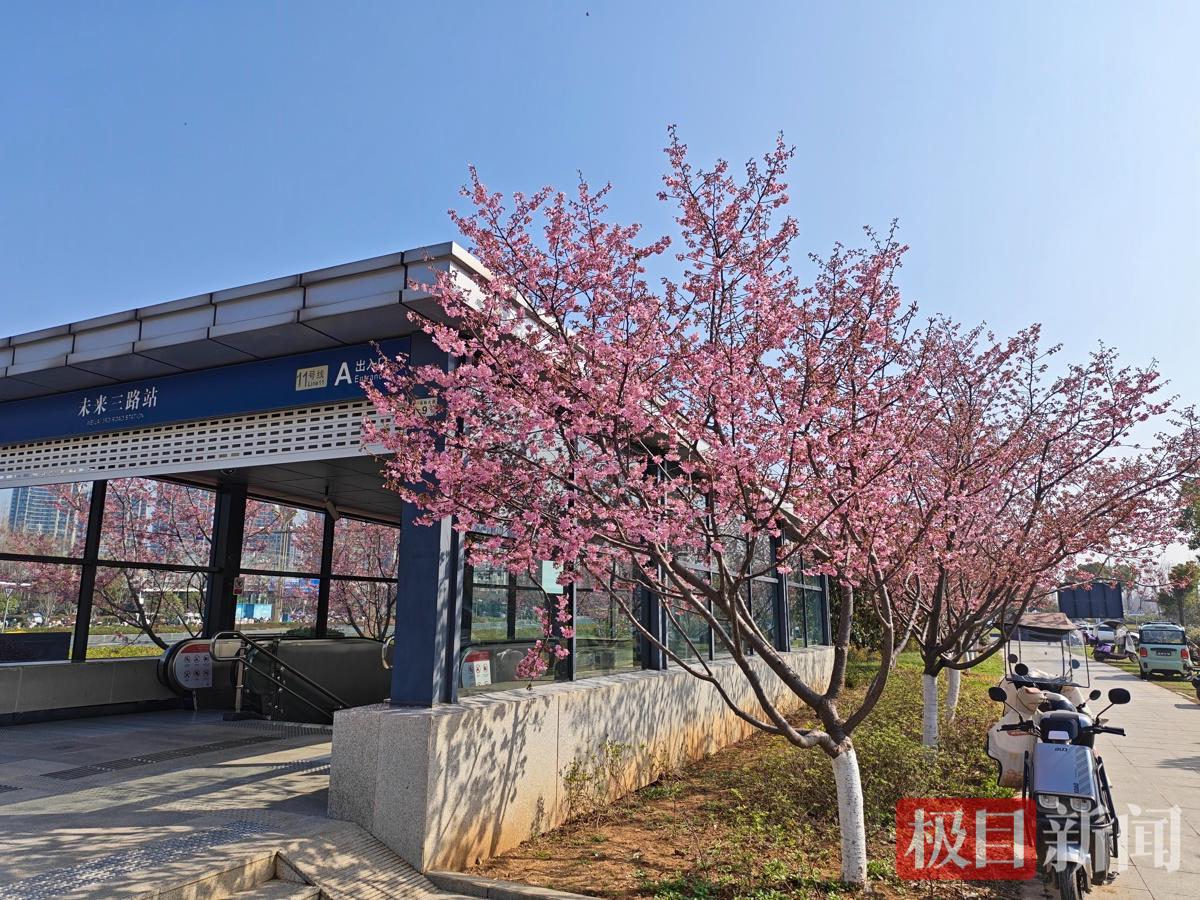 春风十里,不如樱花满站。近日,武汉地铁11号线未来三路地铁站A出口的口袋公园内,83株飞寒樱与44株染井吉野次第绽放,粉色樱云缀满枝头,微风拂过,花瓣轻舞——这座被誉为“武汉最美樱花地铁站”的打卡点,将于本周末进入盛花期。